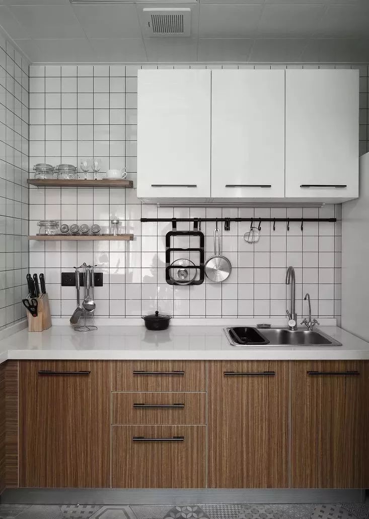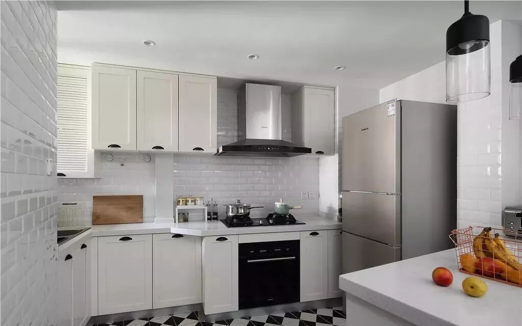 纯白可能有些单调,这个时候可以用局部亮点来点缀:餐具、台面、电器、花卉都是搭配利器。后挡板也有无限创造性,大理石,花砖、马赛克……你想得到的都可以用得上。