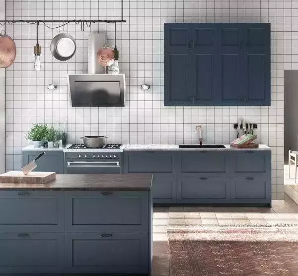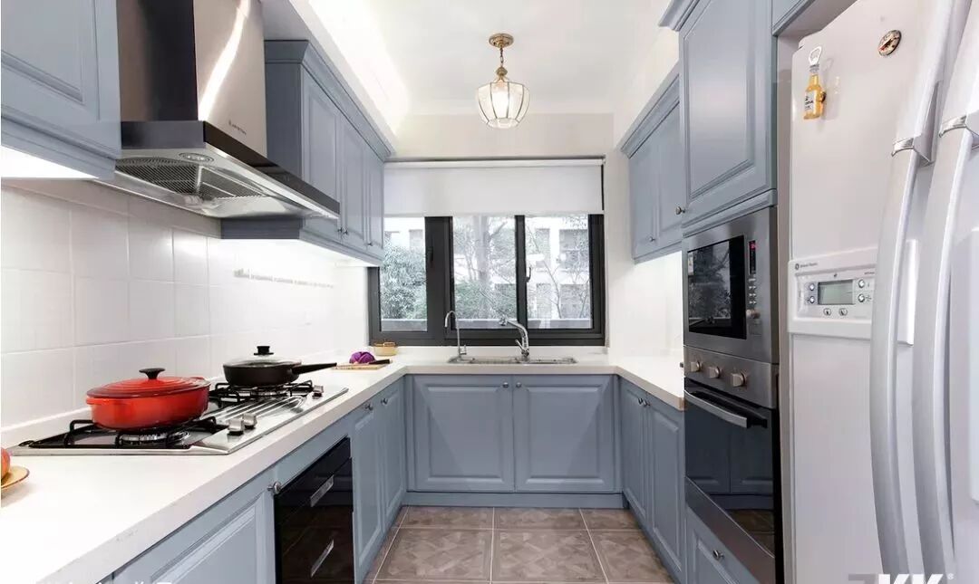 如果橱柜是深蓝色,厨房用灰、白等中性色搭配都ok。