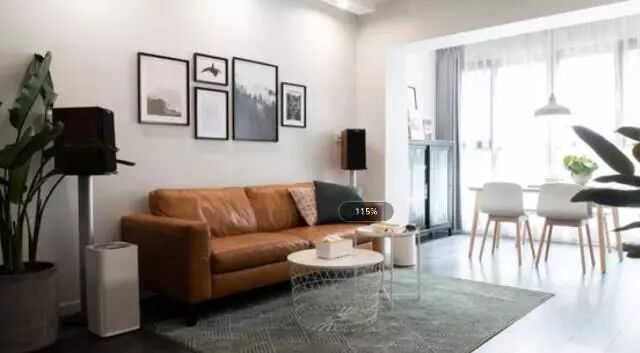 客厅家具主要是来自网购,经典的棕色皮质沙发十分都质感,搭配挂画、灰色小地毯,圆形的组合茶几也让家具的效果更柔和,还能减少磕碰。