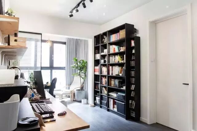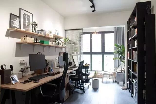 我是自由职业,老公是做IT行业的,所以家里也需要一个独立的办公空间,装了长长的书桌,两个人同时办公完全没有问题,书房外面的阳台可以作为休闲的空间来使用,工作累了,可以在躺椅上休息,还有小茶桌可以喝喝茶聊聊天,很是惬意。