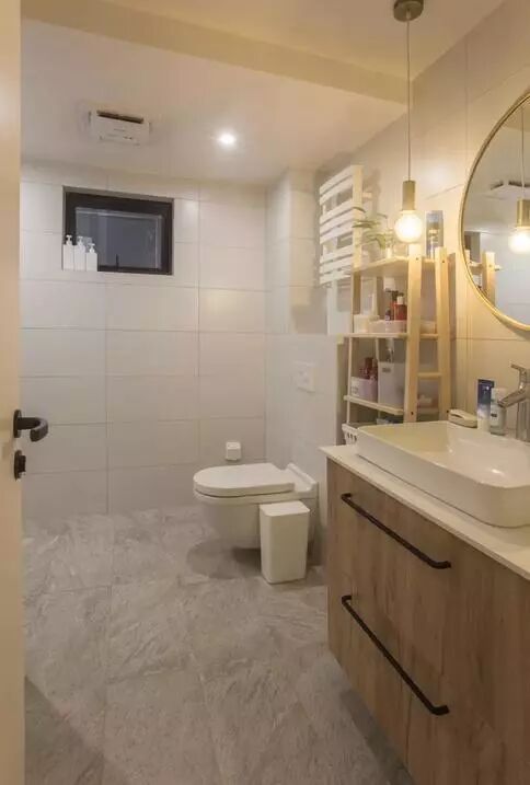因为是两个人居住,所以一个厕所也够用了,房子的通风还不错,而且卫生间也没有太多死角,空间还挺大的,所以没有做淋浴房,因为是南方也不用担心冬天洗澡会冷。洗完澡打开窗户地面干燥的很快,有了淋浴房反而我觉得不好做卫生,有很多死角清洗不到。