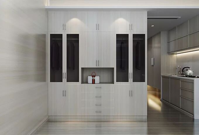 因为简约,所以百搭。可以通过到顶设计,以及选择合适的功能件,比如格子架、推拉裤架、脏衣篓等,进一步提升收纳能力。