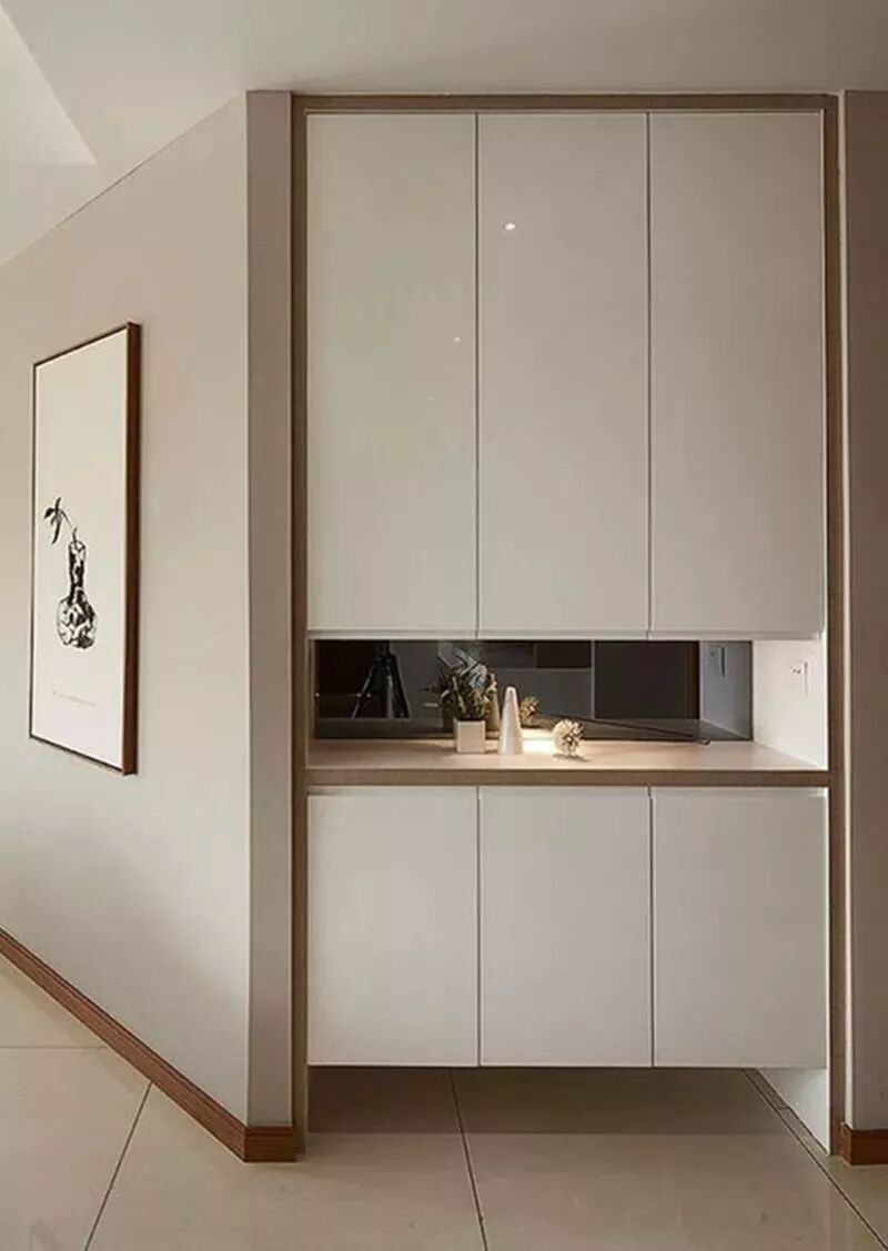 要是你家入户玄关恰好有个凹位,千万不要觉得是鸡肋、头疼~ 别急,入户玄关凹位简直就是天生为鞋柜定制而生。像上图这个,做一个入墙鞋柜,贴合完美,完全不占多余空间。
