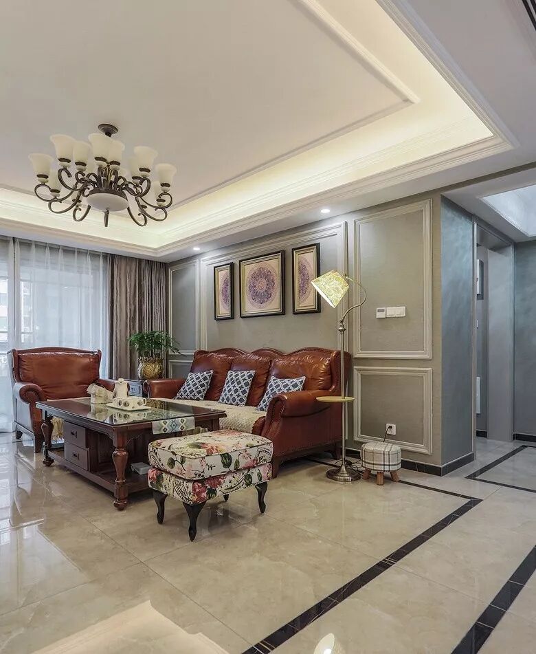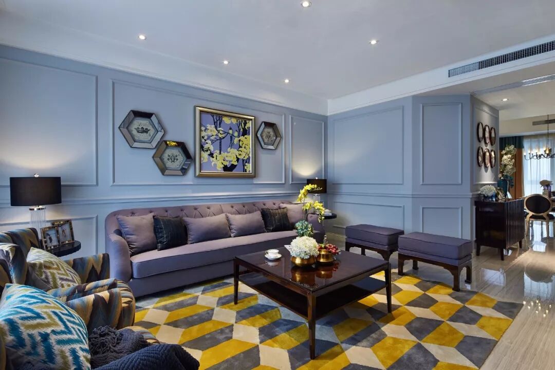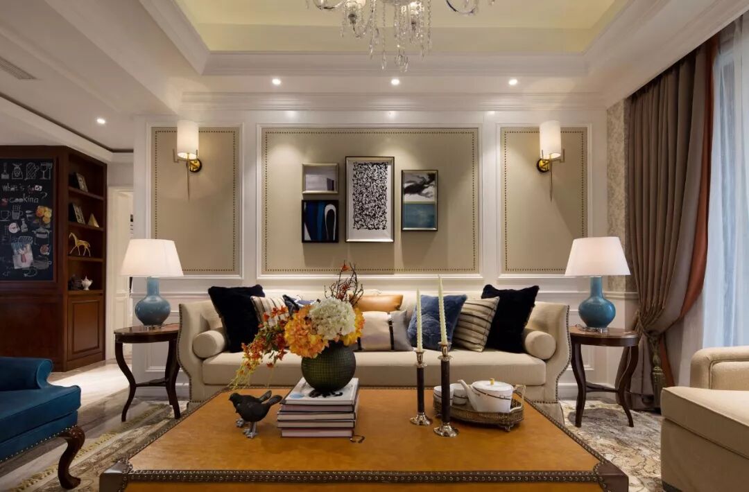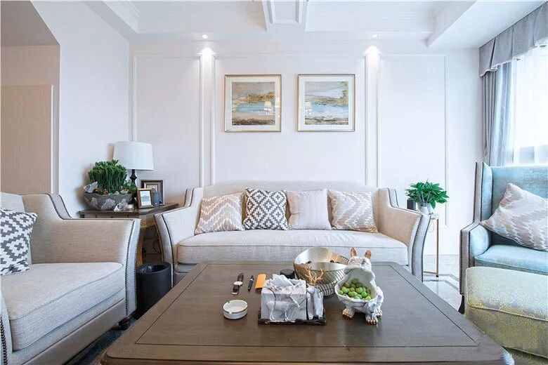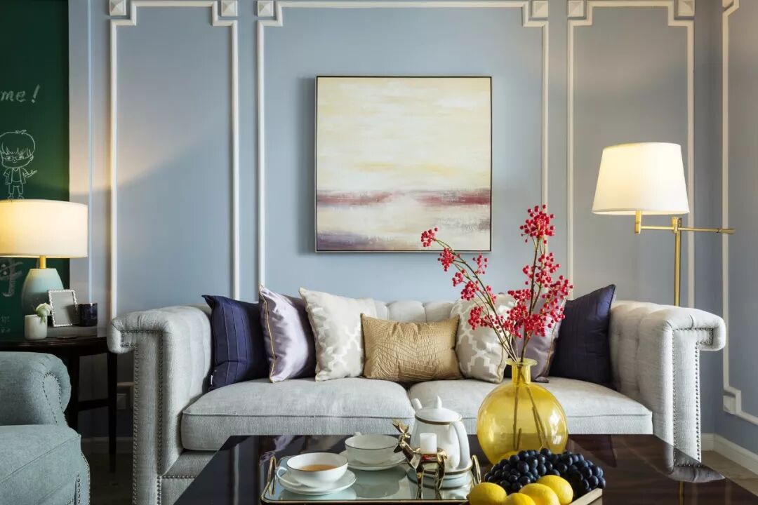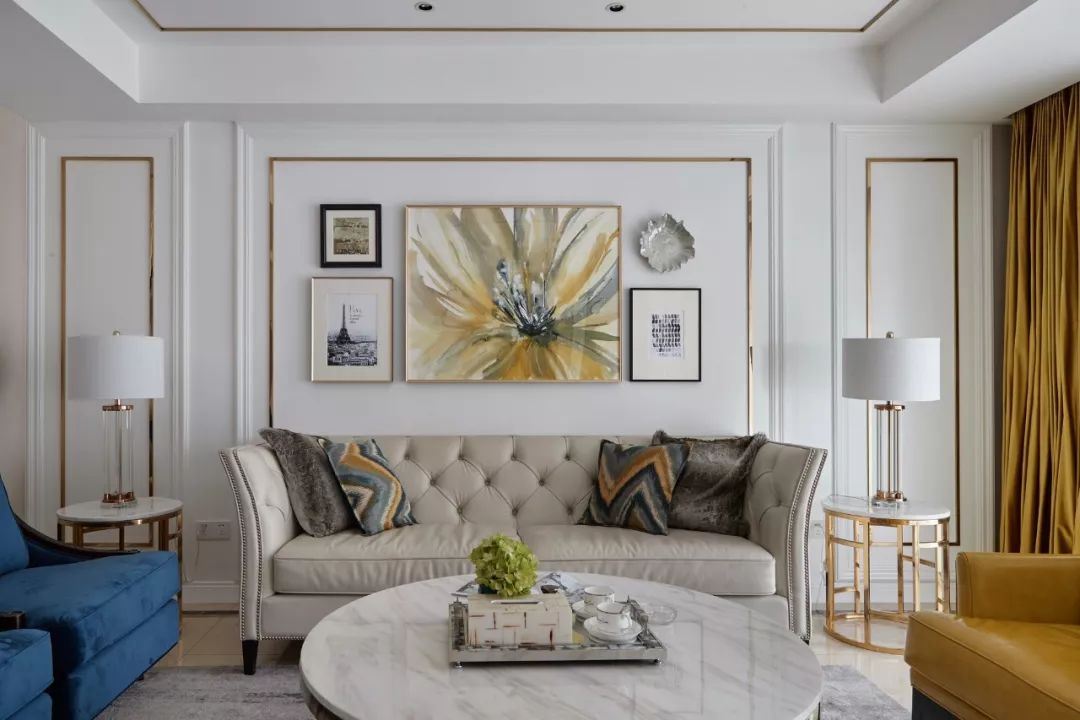 沙发墙与电视墙类似,通过加入边框线条来划分沙发墙的沙发、边几摆放位置,同时挂画的布置也可以结合整个墙面的边框造型来设计,这样让空间显得更有层次与档次感。