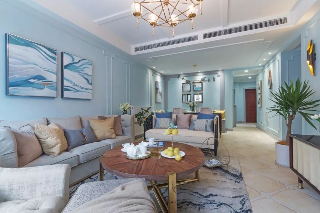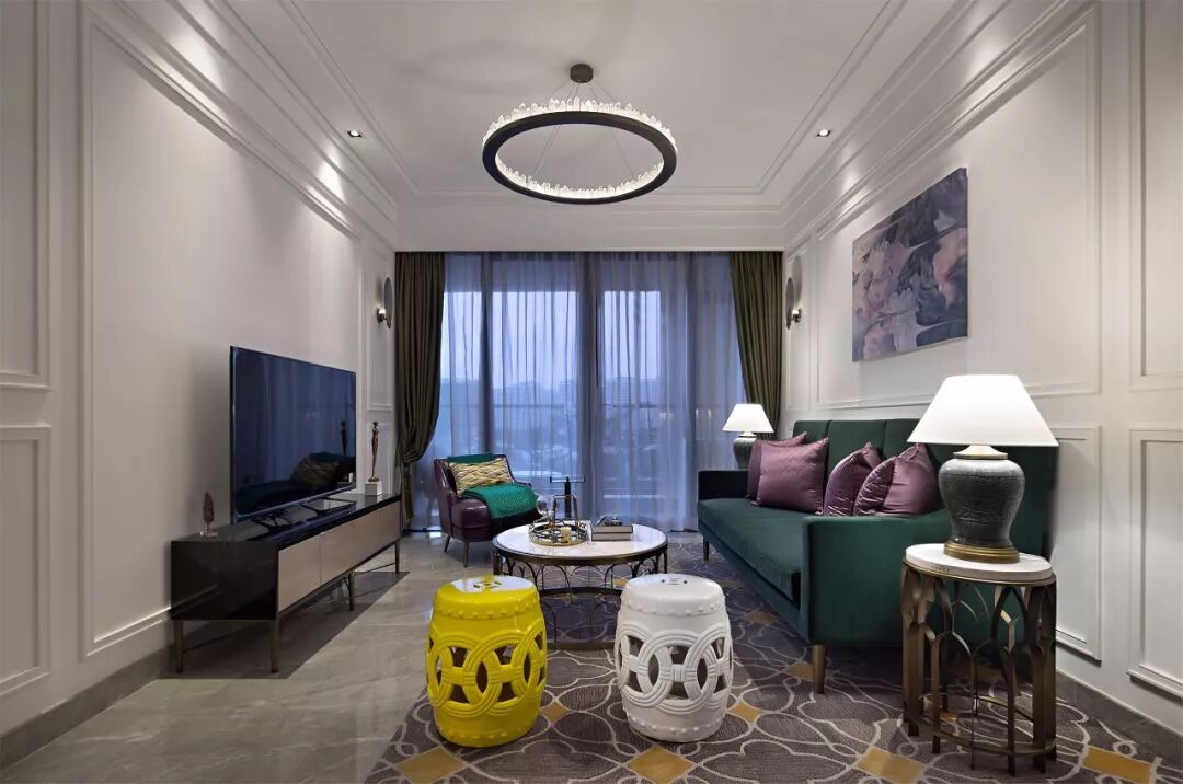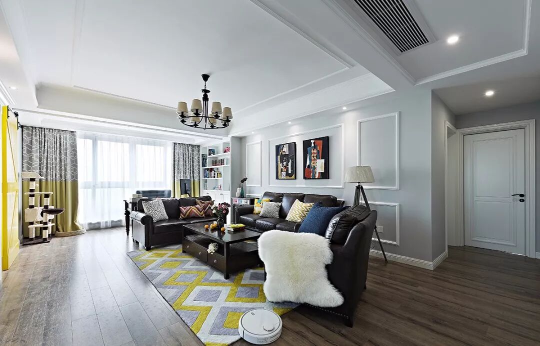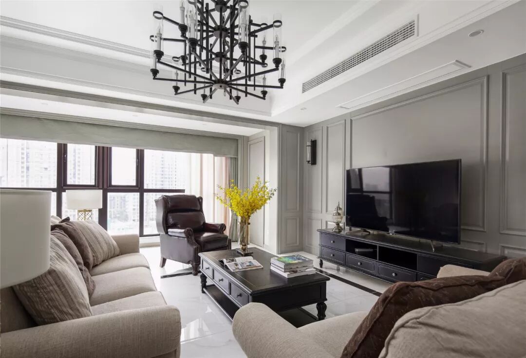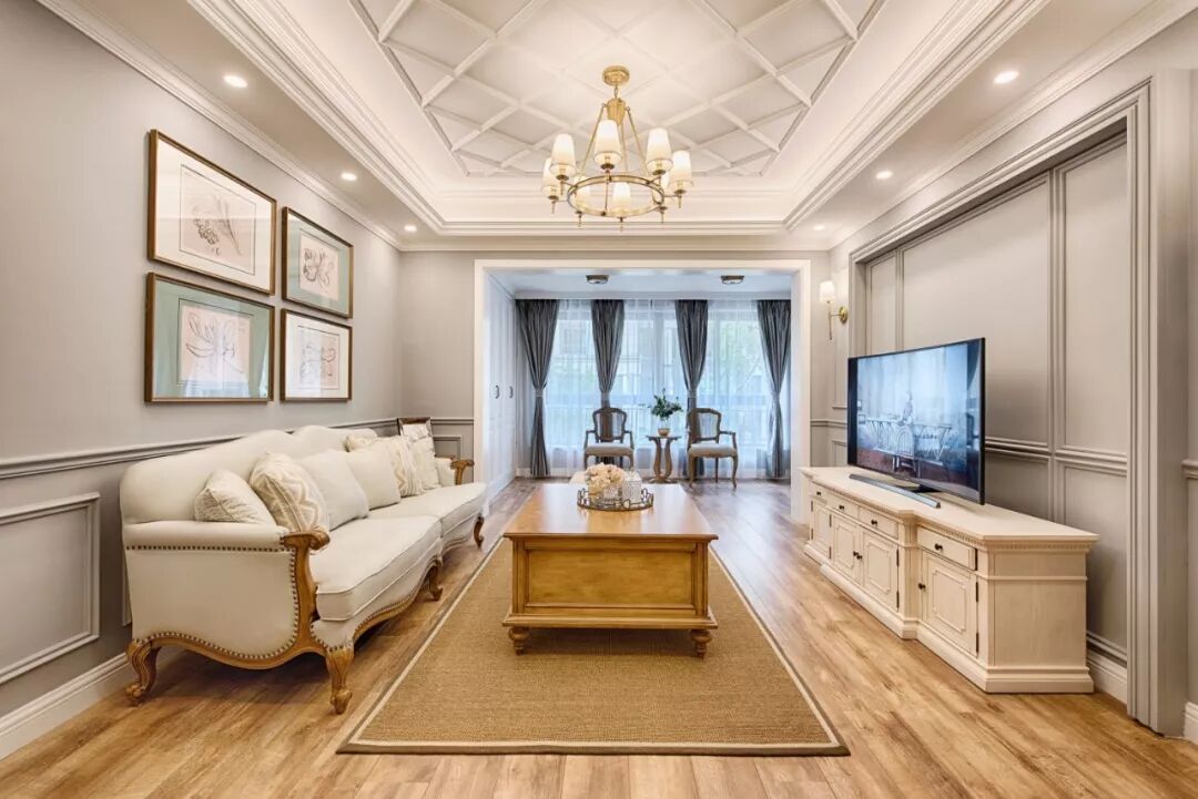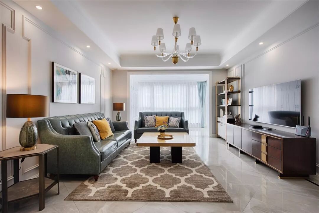 沙发墙与电视墙类似,通过加入边框线条来划分沙发墙的沙发、边几摆放位置,同时挂画的布置也可以结合整个墙面的边框造型来设计,这样让空间显得更有层次与档次感。