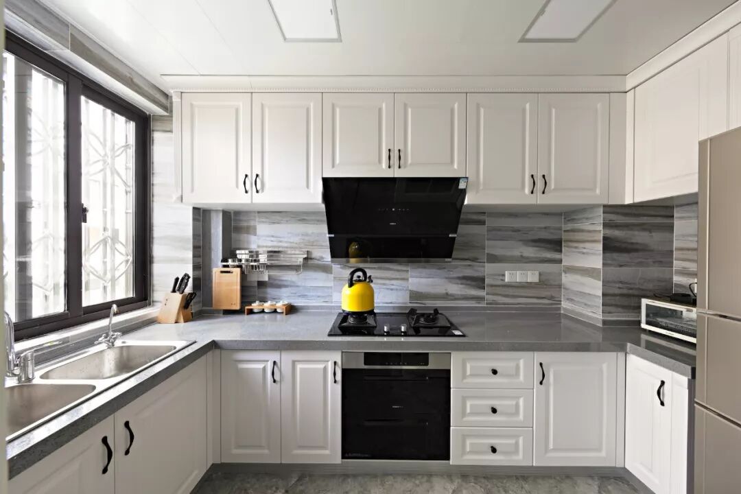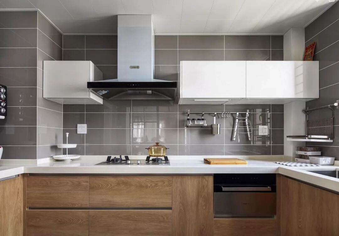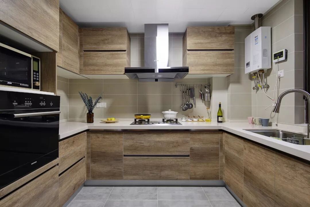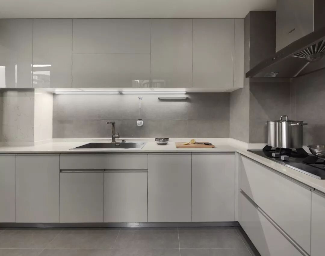 由于基本是颗粒板为基材,所以只能做平面门板造型,顶多做成拼框回字形。有人觉得颗粒板就不环保,其实大品牌的环保指标完全可以的,选择的时候尽量选大品牌板材,比如爱格板、吉林森工露水河板等。(注意是板材品牌,不是橱柜品牌)