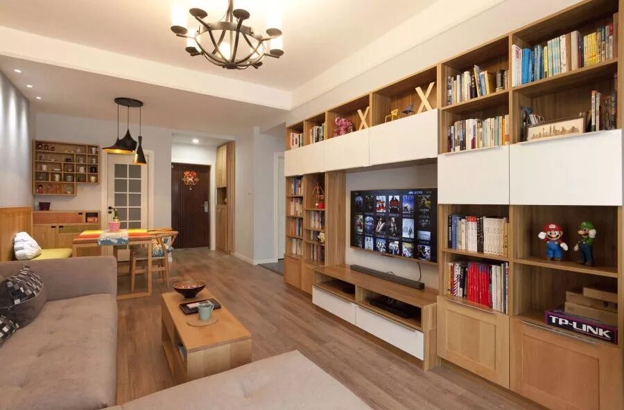 另外如果想利用电视墙做收纳,那么可以根据家里的收纳量来定制电视墙的收纳形式,比如一整面顶天立地的柜子、矮柜、多个小柜组合、搁板等都可以成为收纳的利器。