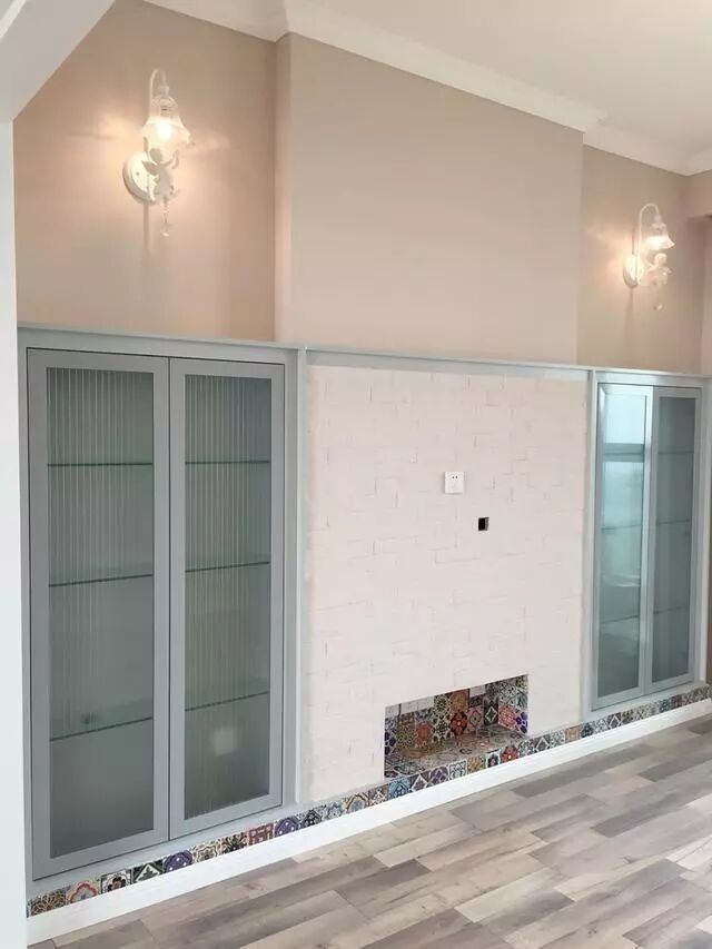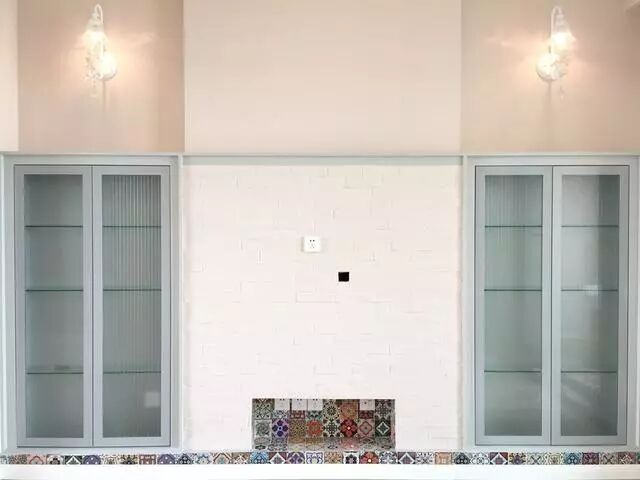 这就是电视墙了,两边玻璃移门里面可以储物,墙体做的文化石,下面掏了一个壁龛,贴上马赛克瓷砖,好赞啊!