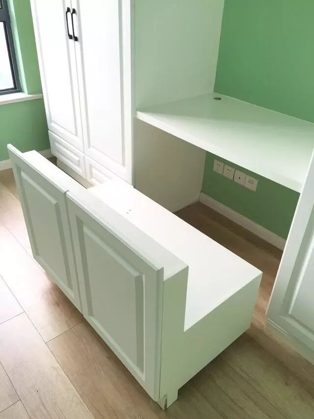 下面的收纳柜,可以拉出来变成椅子,这样就变成了书桌;