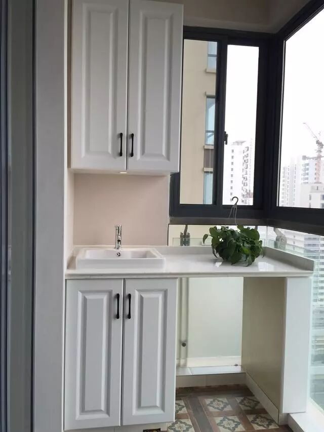 阳台的柜子和洗衣台;
