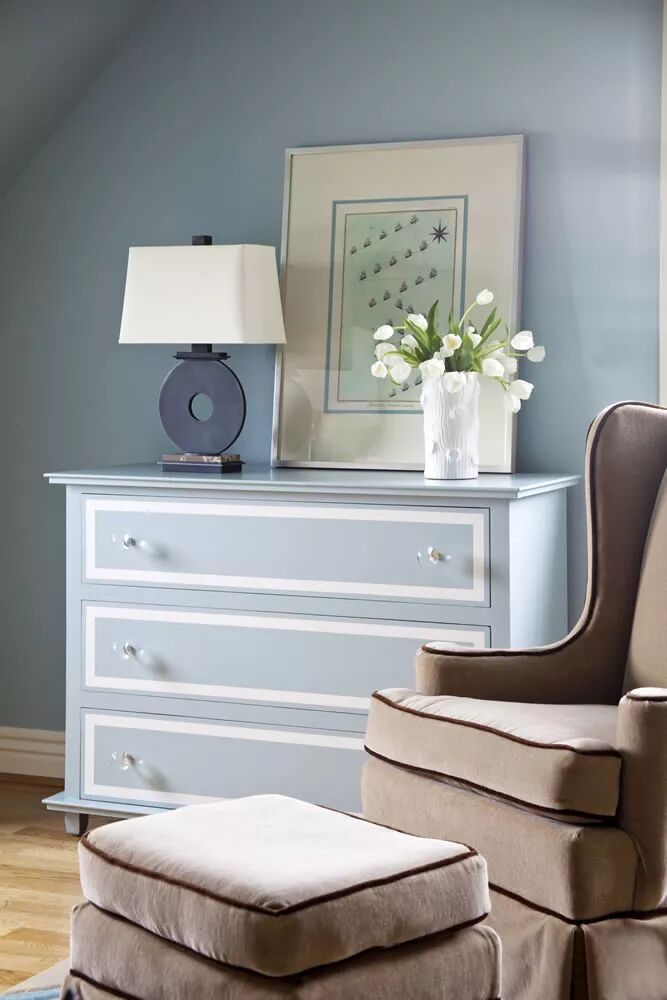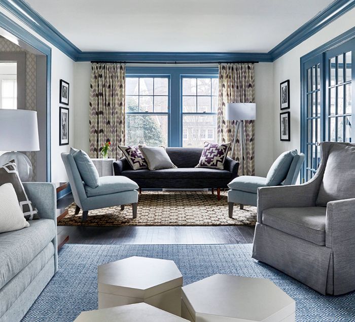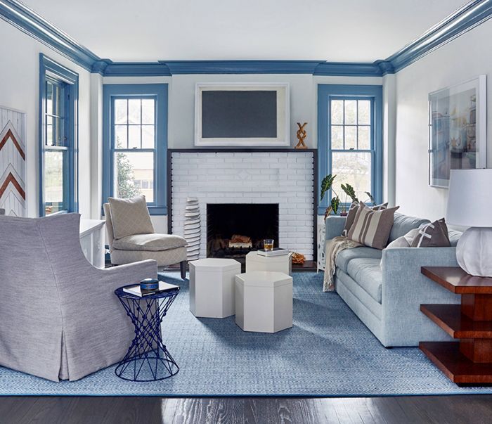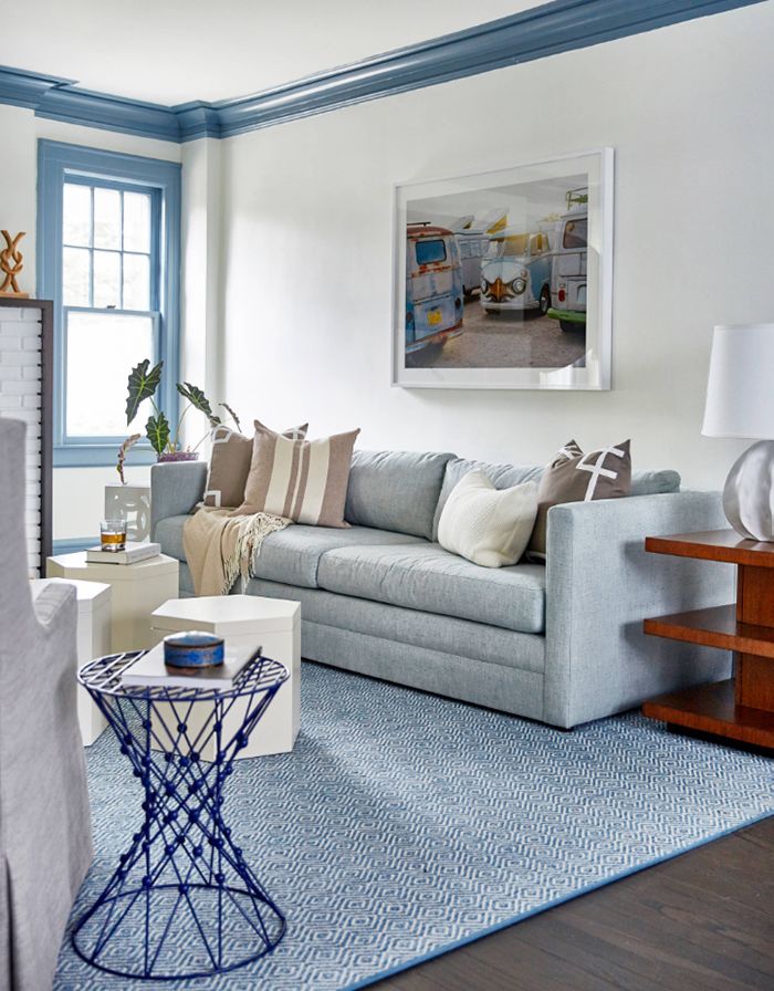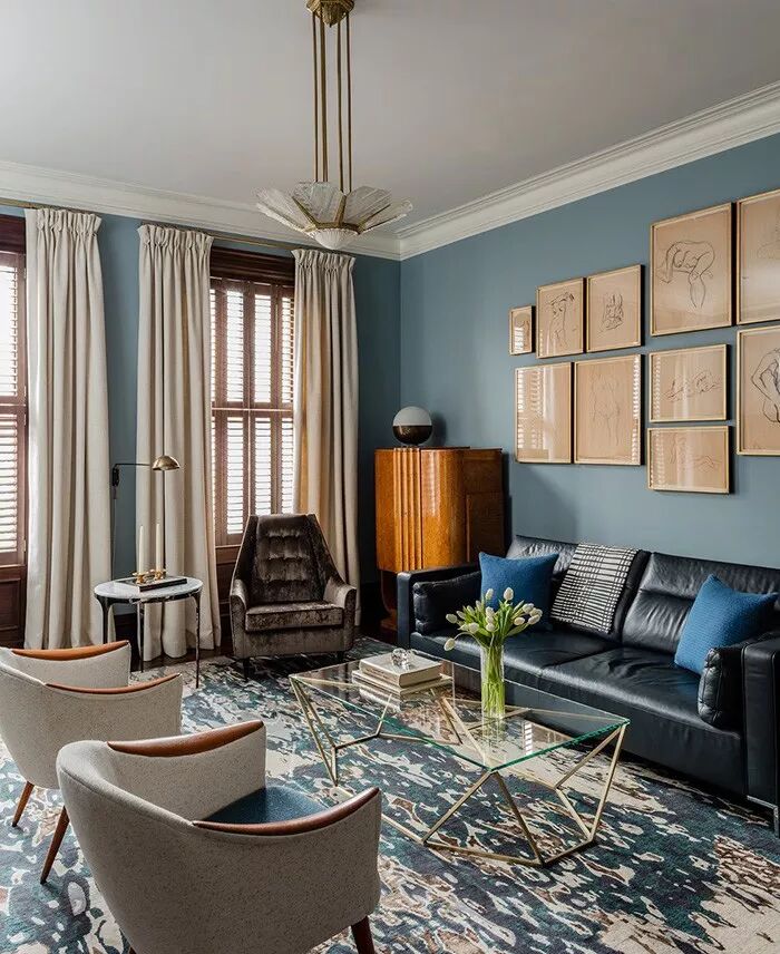 作为大面积的墙面色,灰蓝色表现出温和可亲的气质。无需太艳丽的装饰,米色的亚麻窗帘和沙发干净质朴,温暖底色上笔触简单的素描画;尽管很多时候大家都会忽视,但是地毯的选择绝对至关重要——晕染图案的蓝色地毯像是被风吹皱的海面,富有动感,皮质沙发与玻璃茶几的搭配十分恰当;绿植的点缀则是必不可少。
