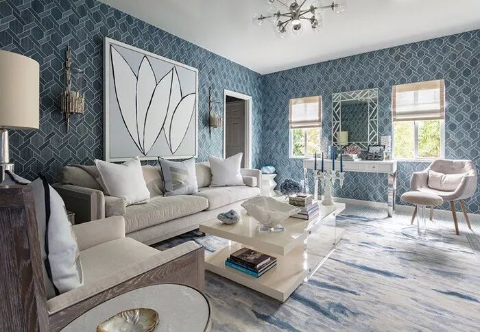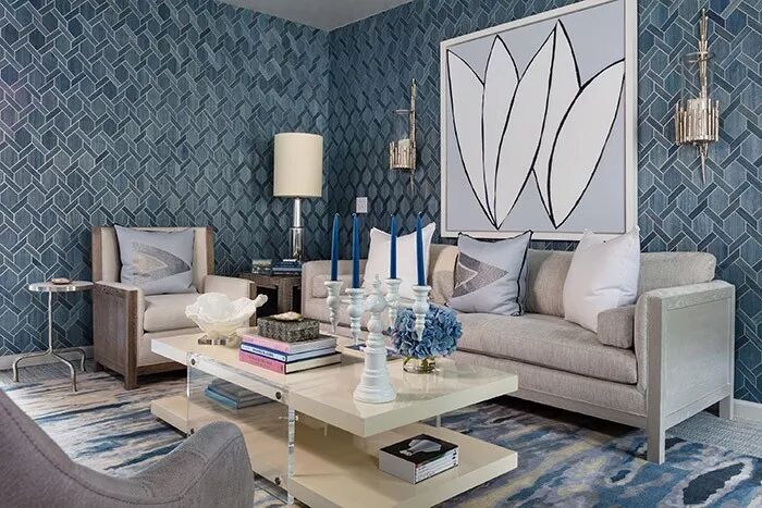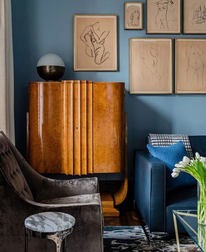 绝美的灰蓝,是仅次于高级灰的装饰色彩,深邃平和的色调中既有着灰色的温柔高雅,也有蓝色的沉静内敛。以灰蓝色作为背景来装饰空间,可打造出低雅舒柔的视感基调,配搭着明度极高的灰白等淡雅的中性色家居内饰,可将这种氛围质感加以强化。若要凸显材质带来的别致韵味与独特视感,可通过壁纸、地毯、茶几、立柜等大件家具装饰加以呈现。