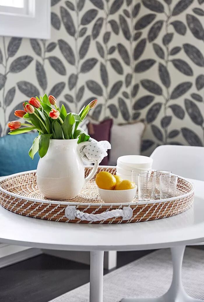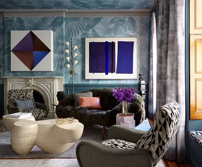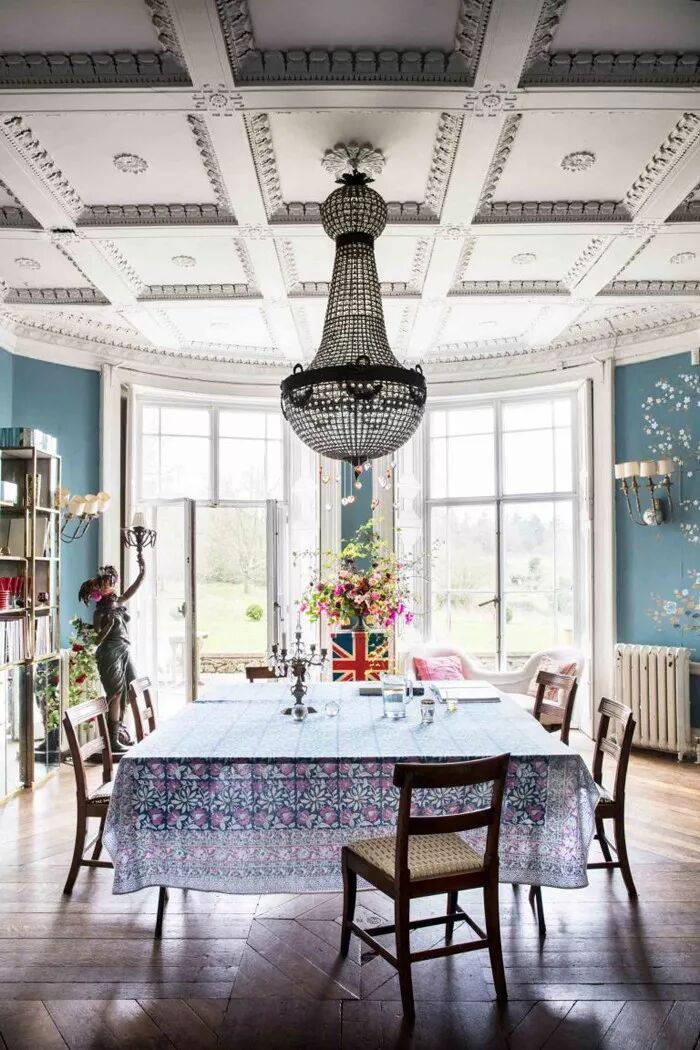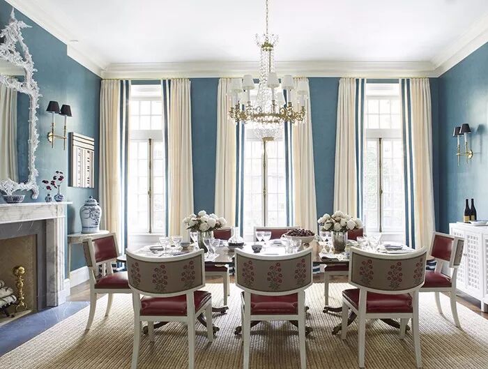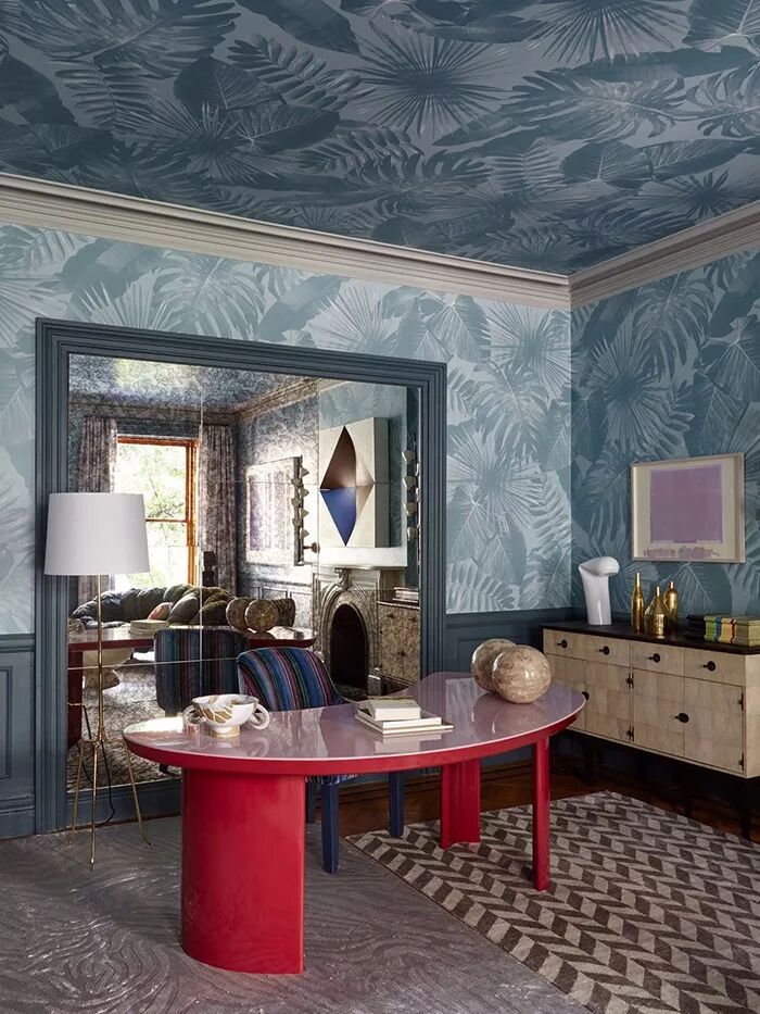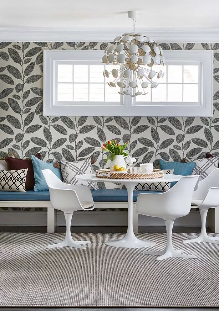 灰蓝色的沉静深邃视感带有着让人深度思考的理性魅力以及强大的平稳感官的抚慰力量。无论置于多么炫彩和视线繁杂的背景中,看到它的一瞬都会令视线条理清晰,层次分明。并在此基础上以其独特的质感打造出令人难忘的家居效果。就像这套案例一样,灰蓝色作为储物柜和餐椅坐垫、靠包出现,它的存在令灰白色枝叶印花壁纸和几何窗帘联合打造的繁杂背景变得理顺而清明,配搭着同样素雅的灰白色餐椅及地毯等装饰,整个空间优雅而迷人。