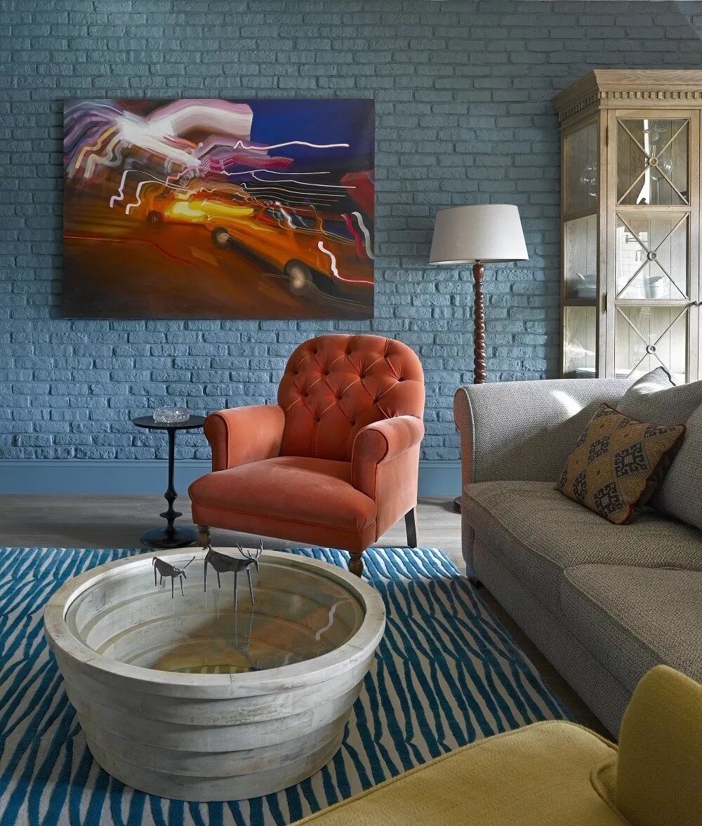 在这套案例中,灰蓝色的砖墙给人一种极具个性的感觉,但在家具的搭配上反而走起了温暖的路线。海港蓝色的地毯上是灰褐色的多人沙发和火焰红色的单人沙发椅,灰褐色高雅,火焰红活泼,一扫冷清,都是贴近人心的格调。抽象的装饰画和造型别致的吊灯则又将初见的不凡展现了出来,不同风格的碰撞,激发了璀璨的火花。