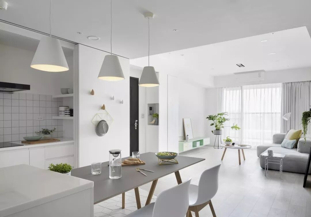 客厅大面落地窗收入充足日光,加乘纯白空间的明亮视觉,搭佐着浅灰色沙发、绿色系电视柜与自然植栽,迎来清新活力氛围。