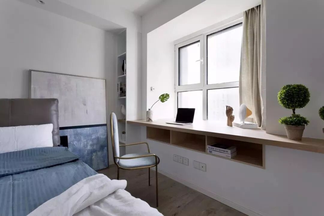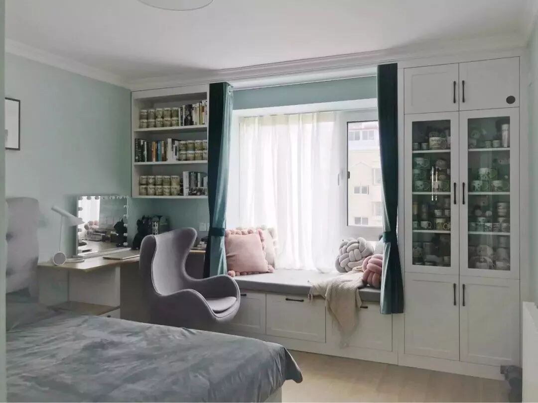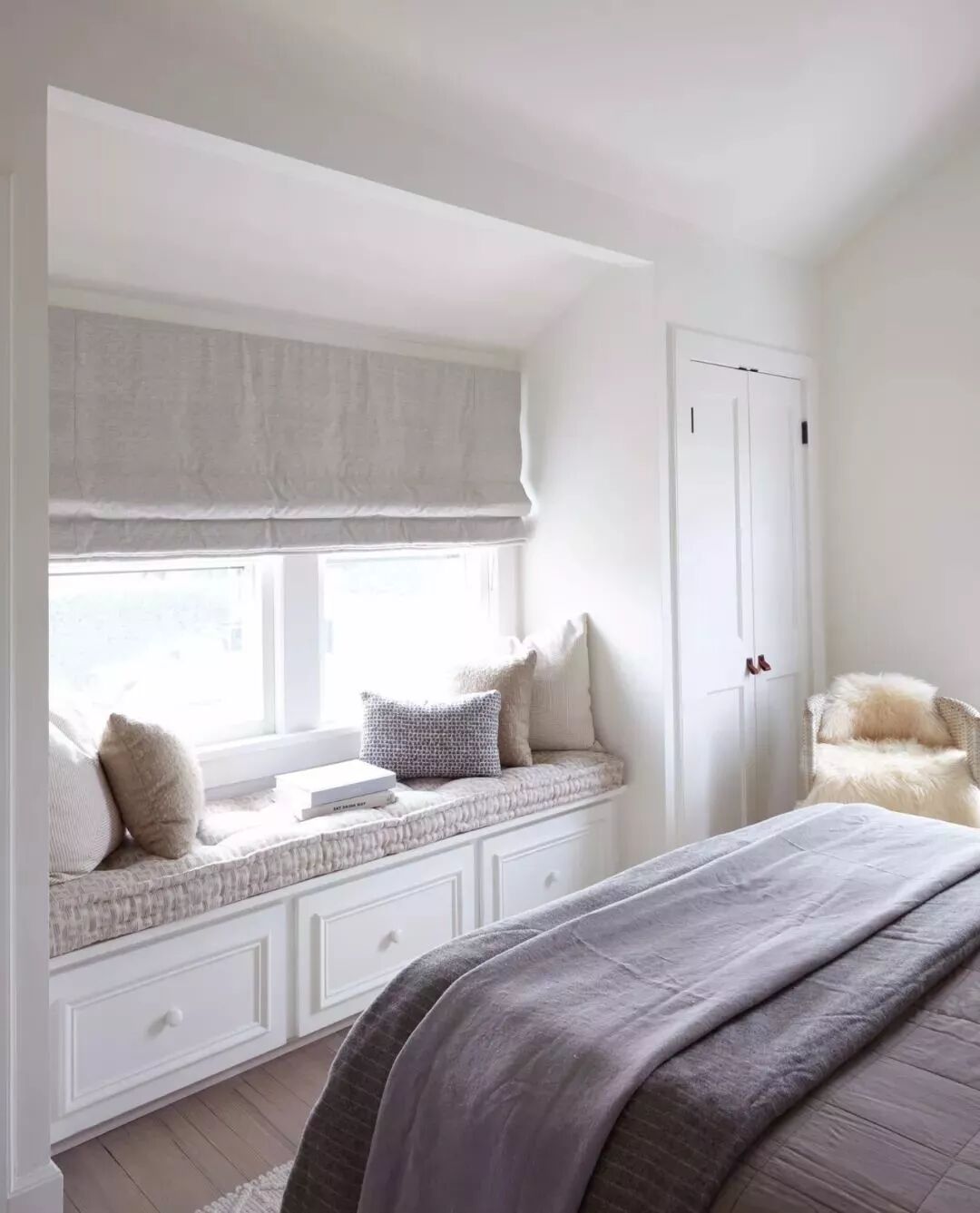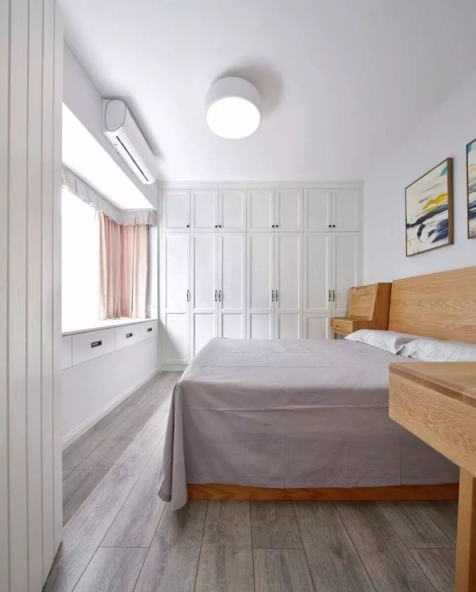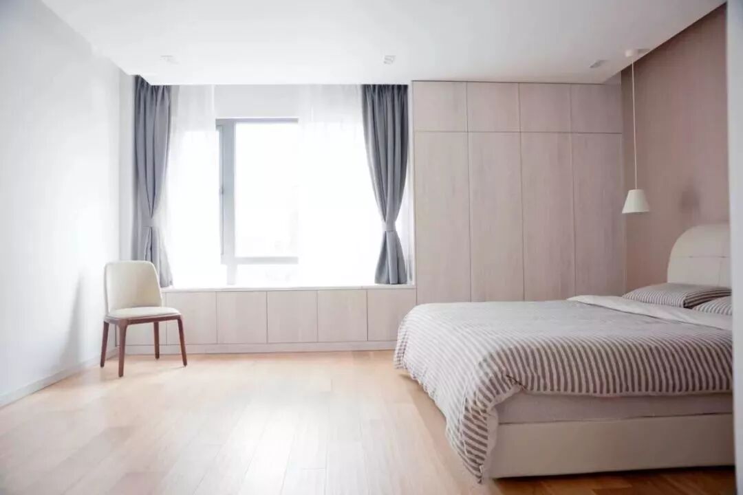 如果是可以砸掉的飘窗,或是后期加装的飘窗,不妨考虑一下把飘窗改成收纳柜,这样可以为卧室增加好几个平方的储物空间,能存放不少换季的衣物或被套,甚至可以在这里存放一些比较大件的行李箱之类的东西。