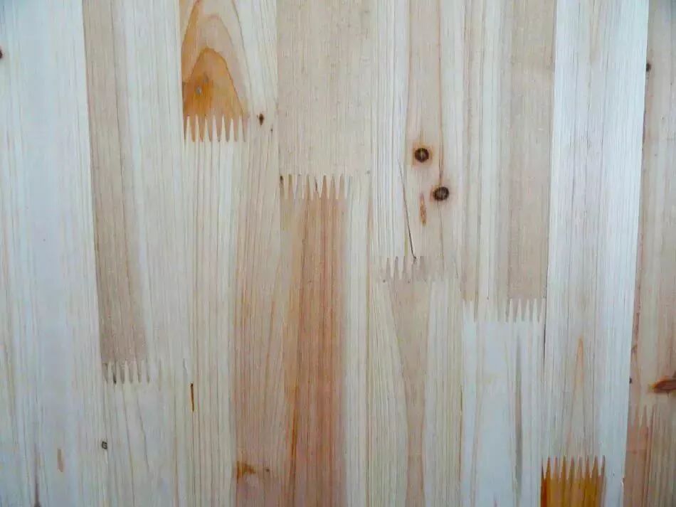 将经过加工处理的实木小块,以锯齿状接口拼接而成,不用饰面。
