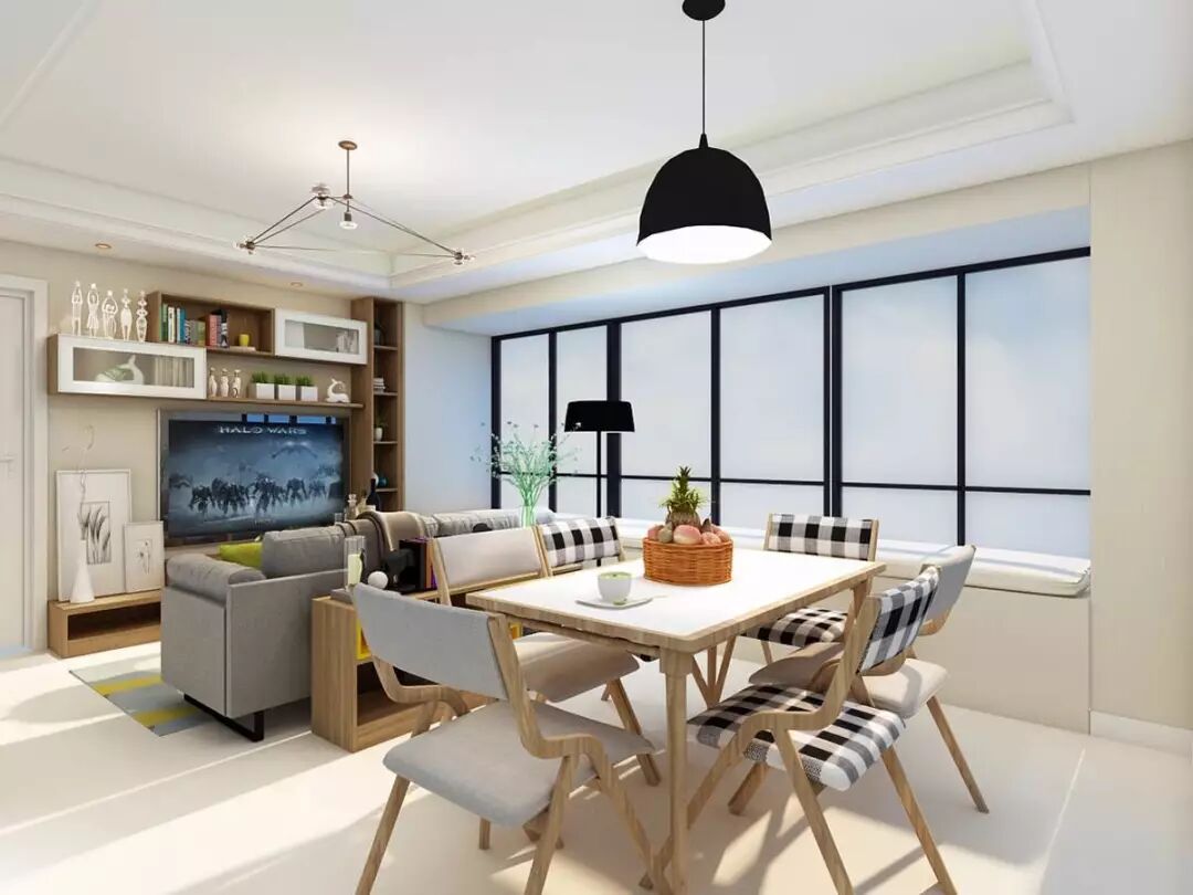 北欧风的公寓设计追求纯净自然的空间感,客厅区域用沉稳的黑白灰沙发搭配柠檬黄抱枕,辅以原木餐桌椅,整体空间色彩简约自然,层次感十足。