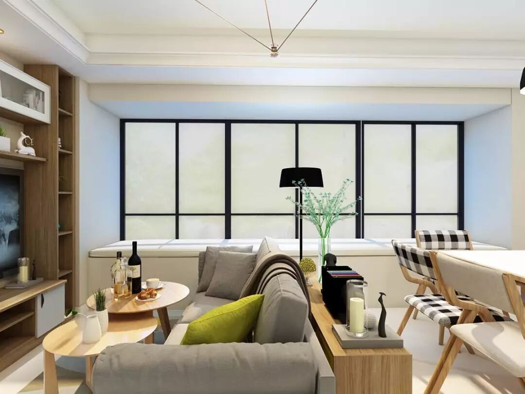 设计师根据业主日常生活动线,巧妙地将客厅和餐厅连成一体,在沙发背后增设一个隔断柜,不仅方便日常物品的收纳,而且可摆放艺术品、摆件等将空间隔开,既温馨、时尚,又能减少硬性隔断带来的视觉压迫感。另外大飘窗的巧妙设计,提高视觉上空间的延伸感,从而拓展整体居住空间,89㎡秒变120㎡!