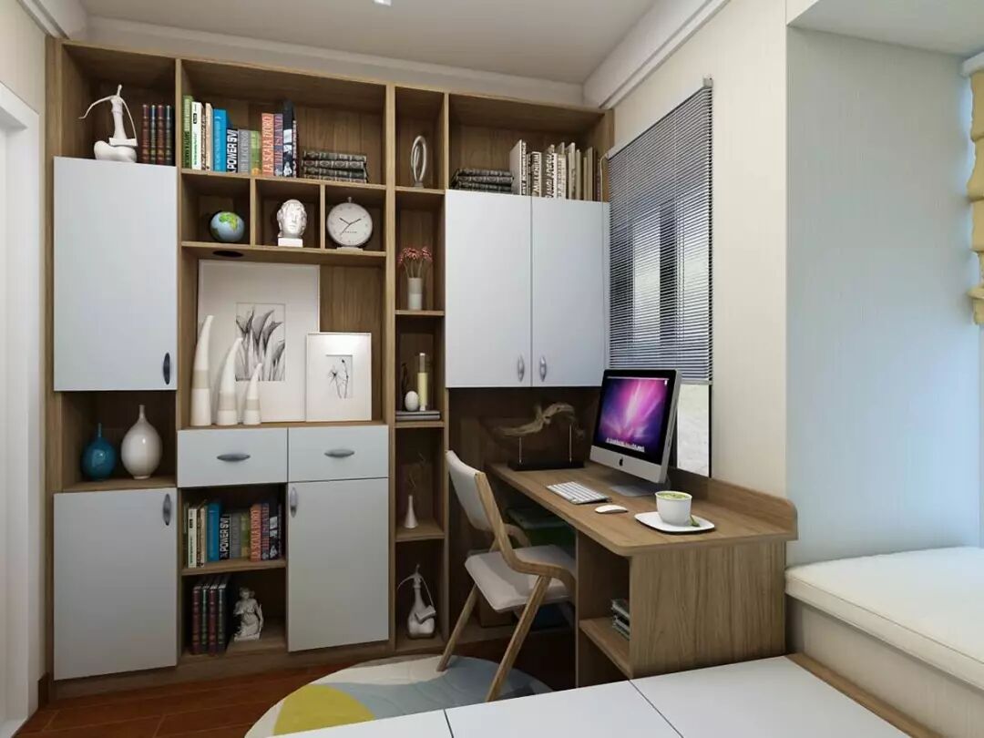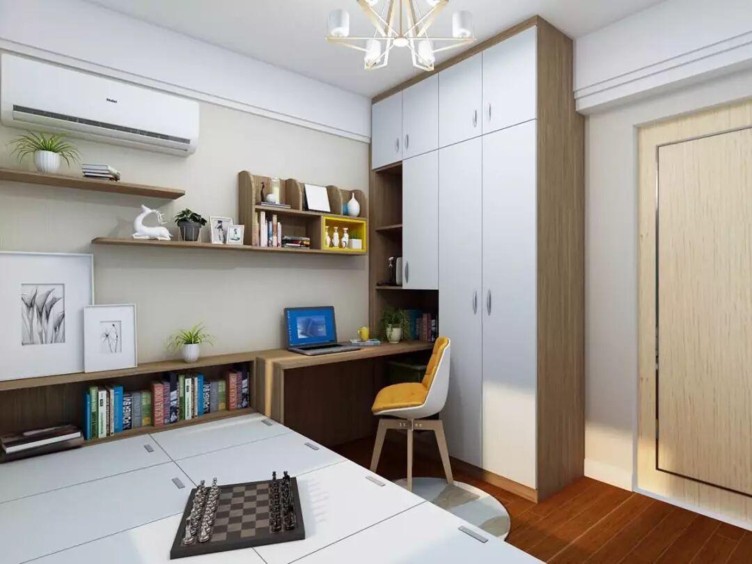 而转角书桌与置顶书柜的设计,小巧灵活,充分利用每一寸空间,在一个小小的区域里同时满足主人办公、娱乐、会客、储物等多种需求。