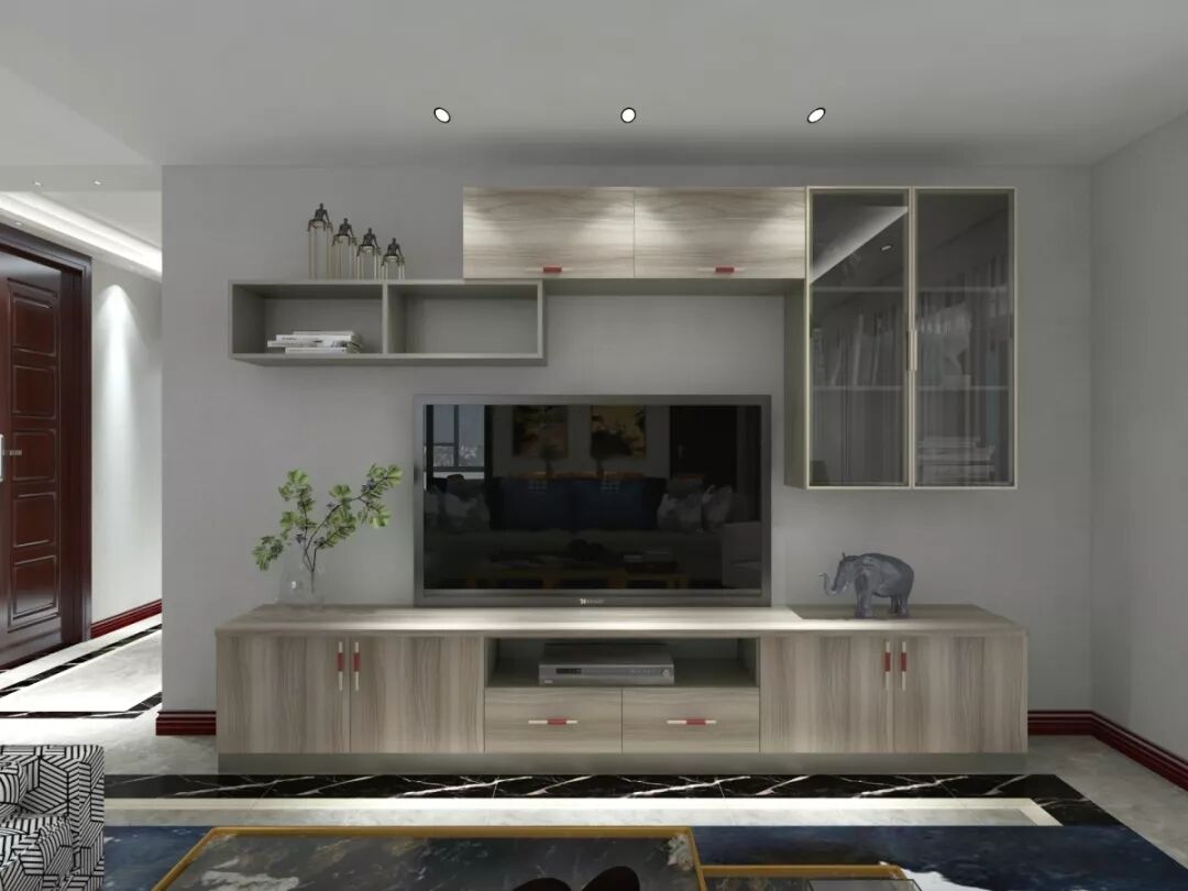 客厅充分利用落地窗,提高整体空间的通风和采光效果;电视柜采用吊柜与矮柜相互结合的方式,上层吊柜可放置艺术品、摆件等物品,下层矮柜可轻松存放遥控器、数据线等物品;同时通过上翻门、铝框玻璃门的搭配,错落有致,打破整体空间的沉闷感,使空间的造型和层次更加丰富。