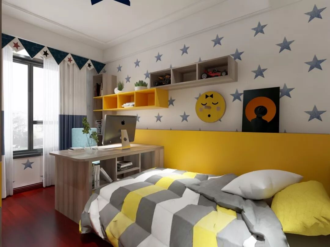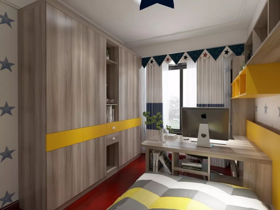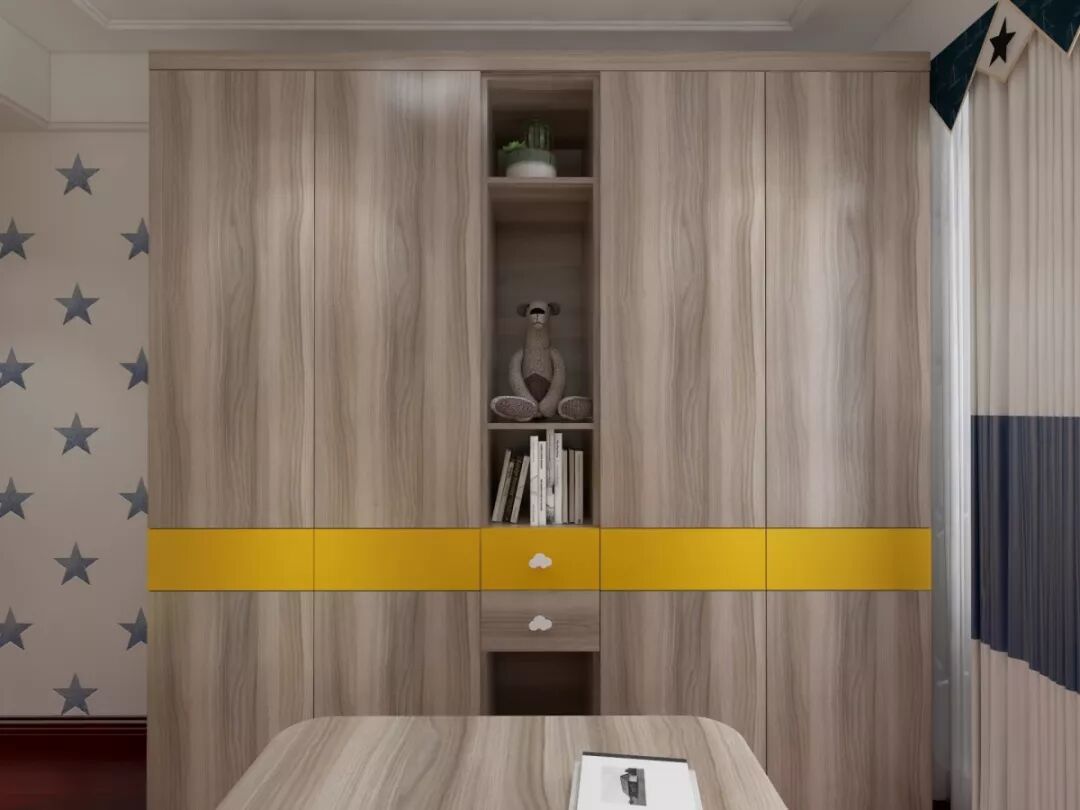 儿童房沿用整体设计元素,以柠檬黄作为撞色提高整体空间活力,并通过吊柜、书桌、榻榻米等灵活设计,提高整体空间格调,打造一个温馨、充满活力的儿童空间。