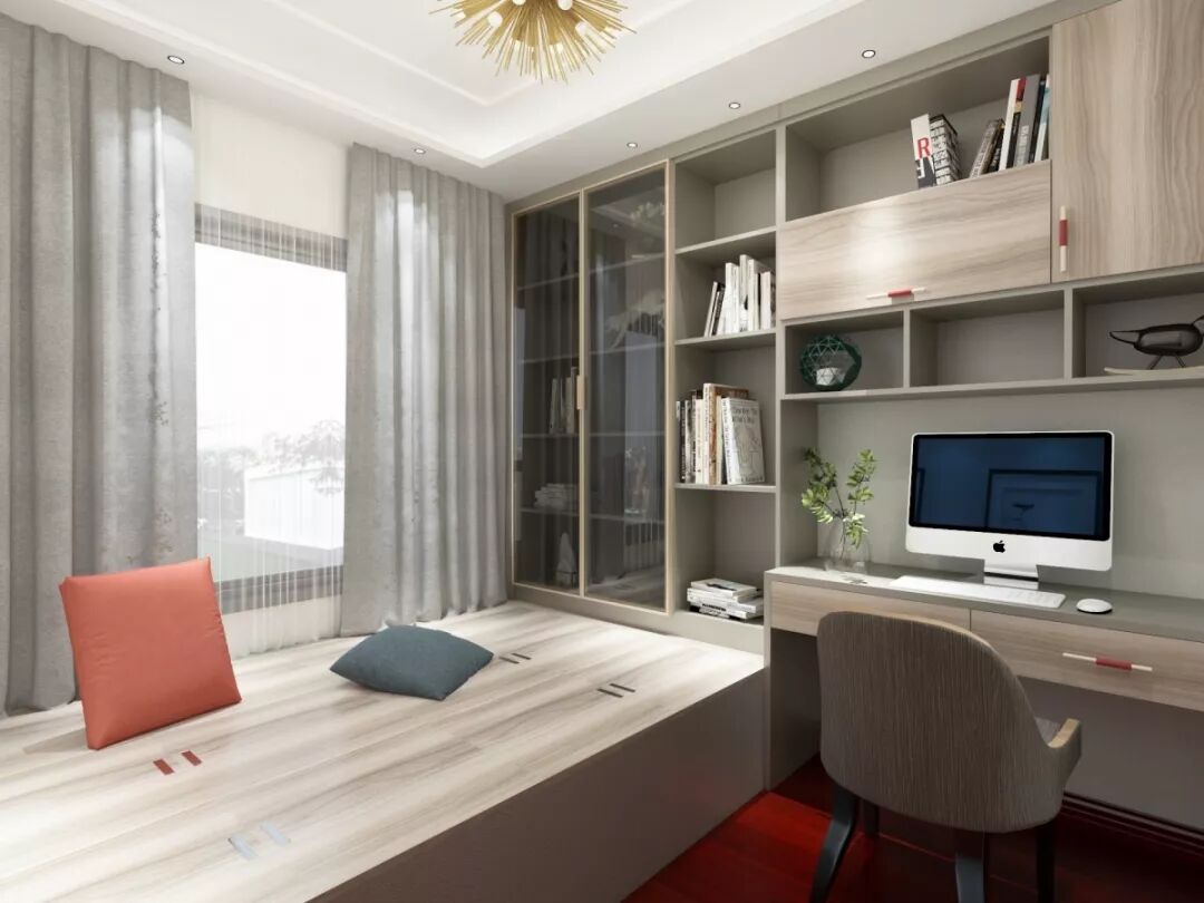 设计师根据业主的需求,将书房改造成多功能房,通过书桌、书柜与榻榻米相互连接,一次满足主人储物、娱乐、办公等多种需求。同时以封闭与半封闭设计相结合,丰富视觉感受,提高整体空间通透感。