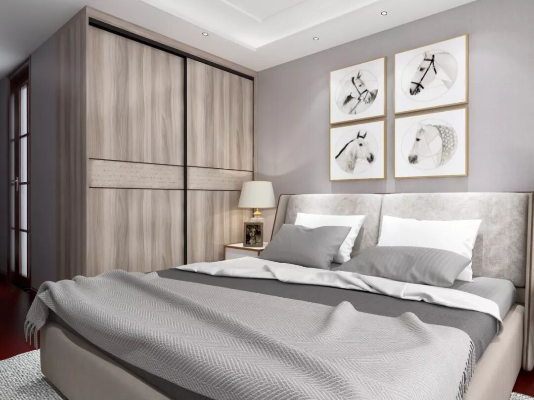 主卧衣柜采用一柜置顶,整体美观、大气,并增加衣柜内部储物空间,方便主人分类存放衣物与饰品。同时饰以精巧的灯具和雅致的挂画,呈现出一种轻奢感与时尚感。