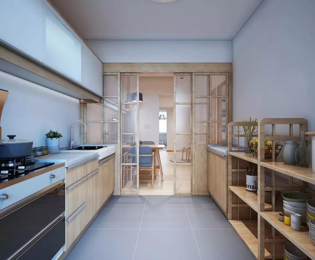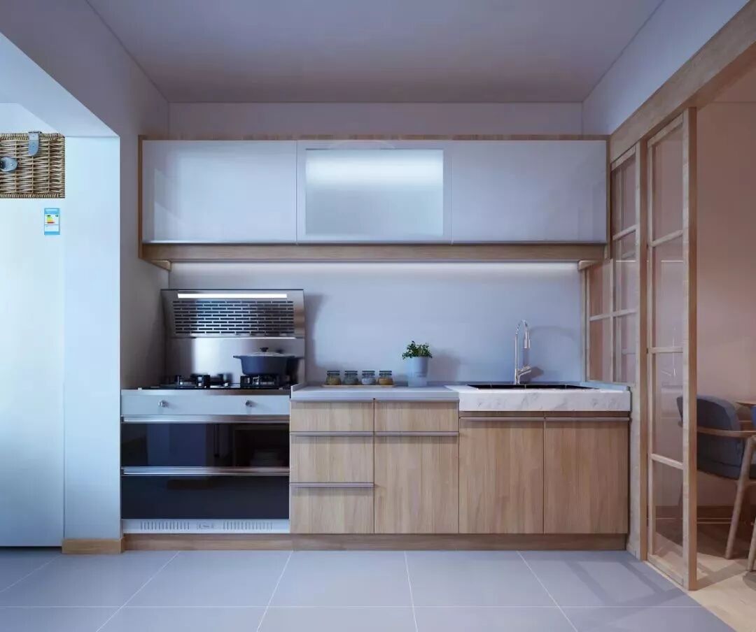 改造后,闪亮的白色+木色系厨房,让人无法辨认出竟是同一个空间。整洁的调料架摆放成一排,让厨房的各类小物件都有了安身之所。
