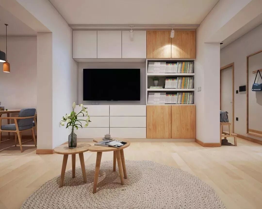 新的电视背景墙增加了充足的储物空间,用来存放以前的书籍和生活用品。朴实的棉麻地毯和清爽的绿植,为空间带来大自然的清爽。