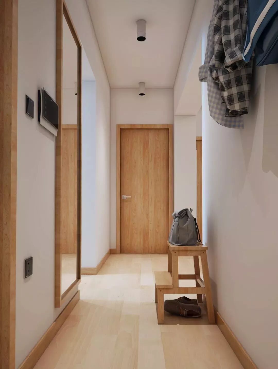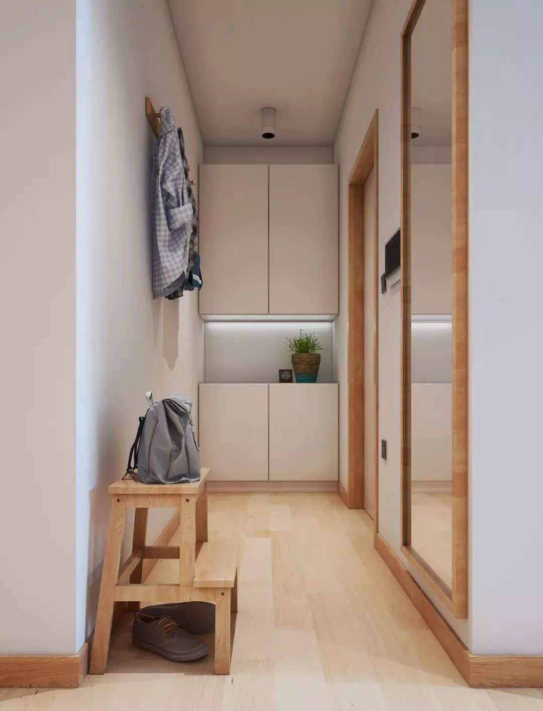 经过翻新的门厅由白色的柜子和木制的装饰组成。嵌入式的鞋柜,干净整洁,让人焕然一新。中间开放式的格子搭配白色LED灯条,让展示品显得格外精致。让人对家的第一印象是明亮而热情的。