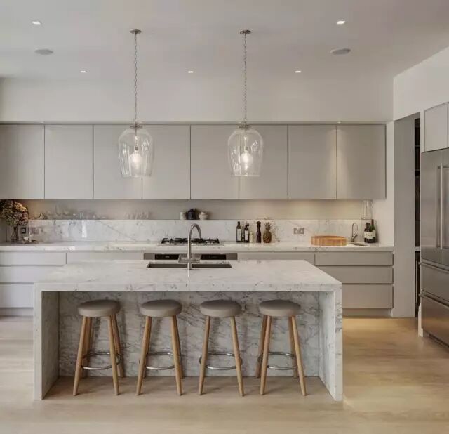 大理石台面+后挡板设计,不仅丰富了整体空间的色调与层次,而且凸显厨房的时尚范儿,烘托出高端的气息。