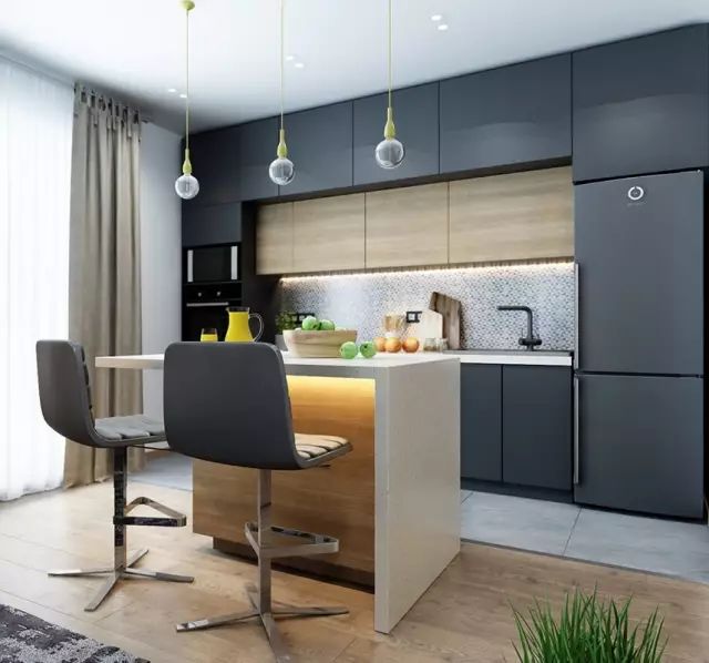 在顶面安装一排创意十足的吊灯,能够瞬间调动空间气氛,大大提高厨房的品位与档次。