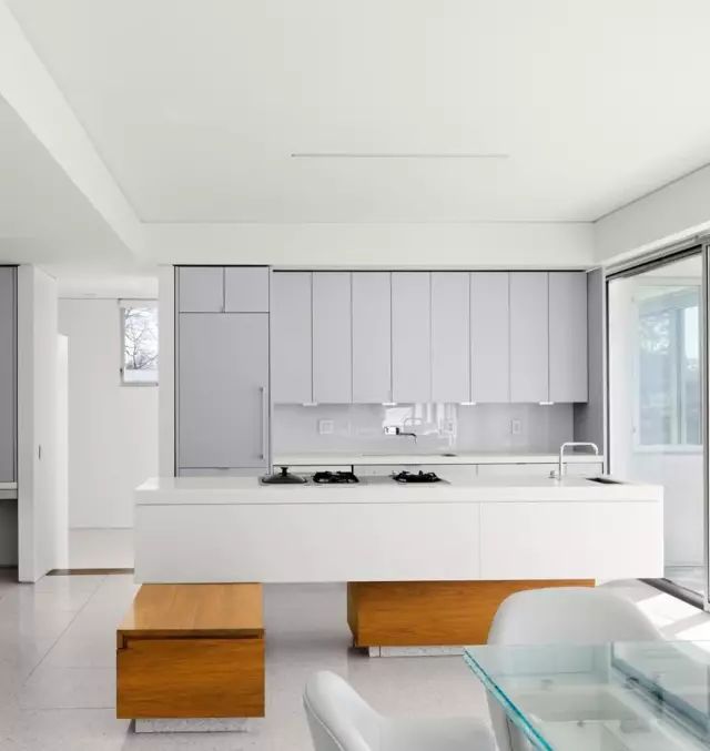 明亮的采光环境,再加上绿植、木地板、白色橱柜和线条流畅的功能性家具,让厨房看起来更加自然优雅,打造成一个充满幸福感的惬意空间。