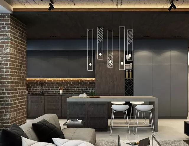 粗糙质朴的裸砖元素,搭配暗色系木质橱柜,金属等不同材质后,让整个厨房空间变得更有层次,再加上灯光造型的加持,营造出一个高级神秘的氛围。
