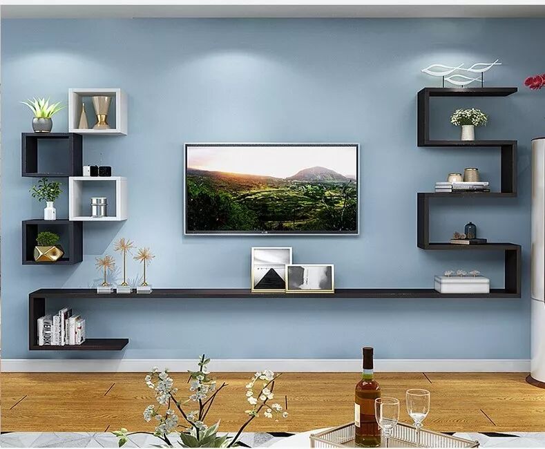 不管是一块长搁板还是几块组合式搁板,或者搁板和收纳柜的组合,既可以摆在电视上方或者下方,也可以选择在左右两侧。