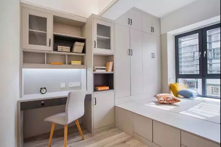 借用飘窗面积组合榻榻米设计,定制全屋家具,将面积不足5㎡的小卧室打造成多功能房间,书房、游戏室、休闲室、茶室、卧室等功能随意切换。
