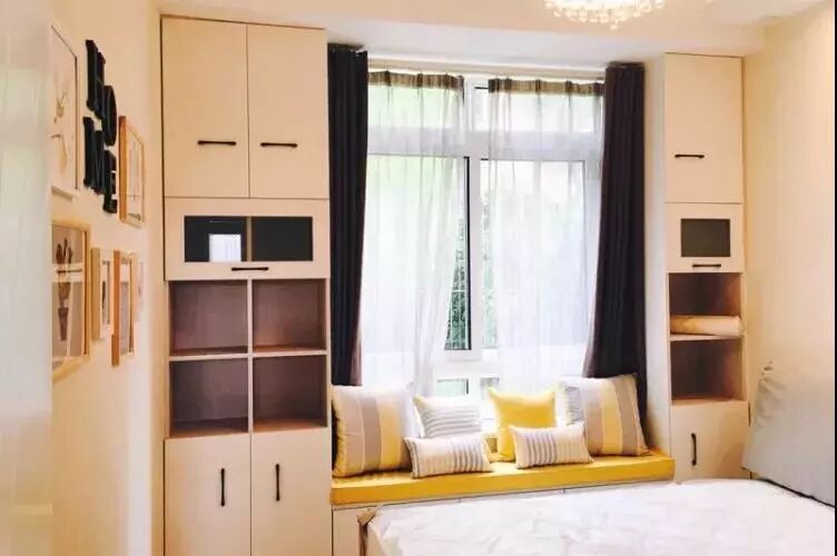 如果家里是中国式的假飘窗,不适合改成休闲区,就垫一层收纳柜子,扩大空间收纳量,同时也增加了高度可以兼顾到休闲功能。