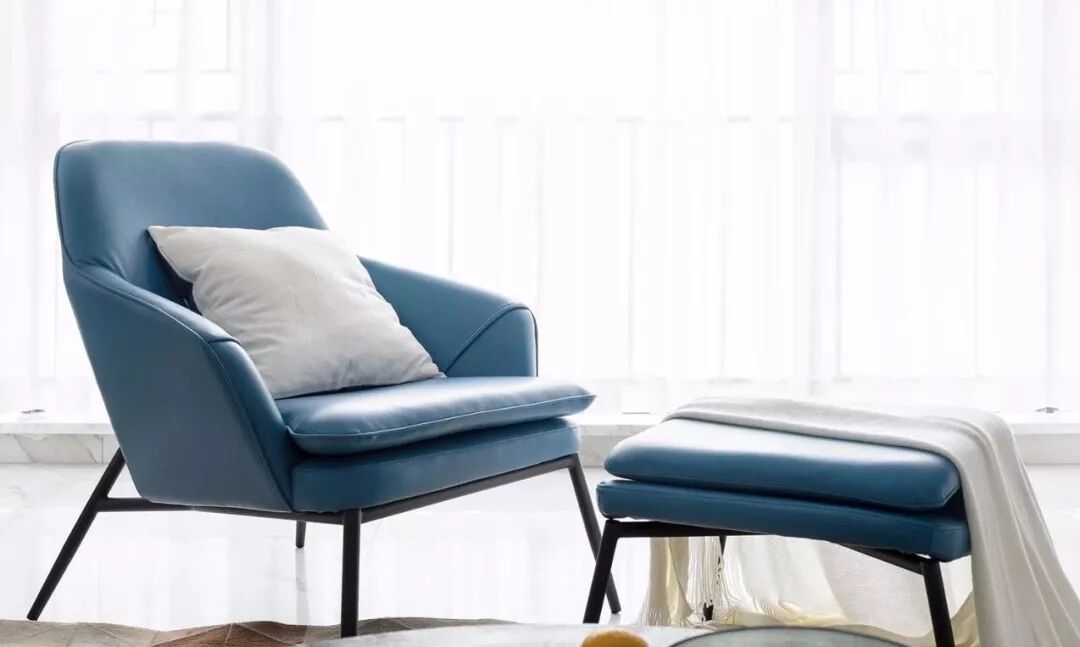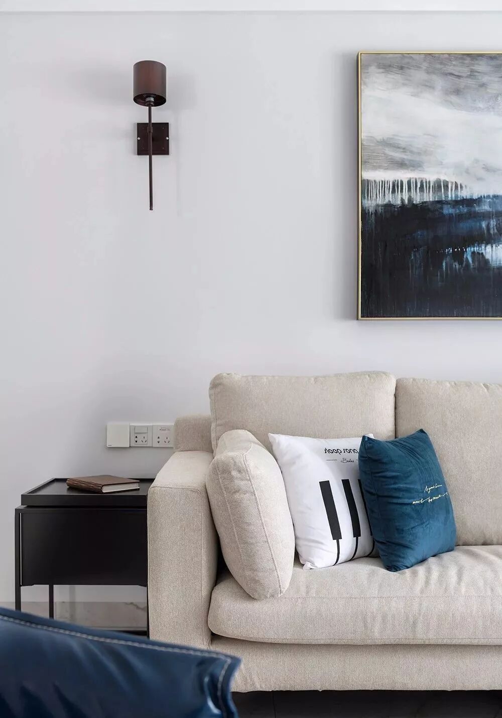 ▲ 背景点缀装饰画与壁灯,搭配北欧风吊灯,米白布艺沙发,菱形线条的地毯,靛蓝单人皮具沙发分布两侧