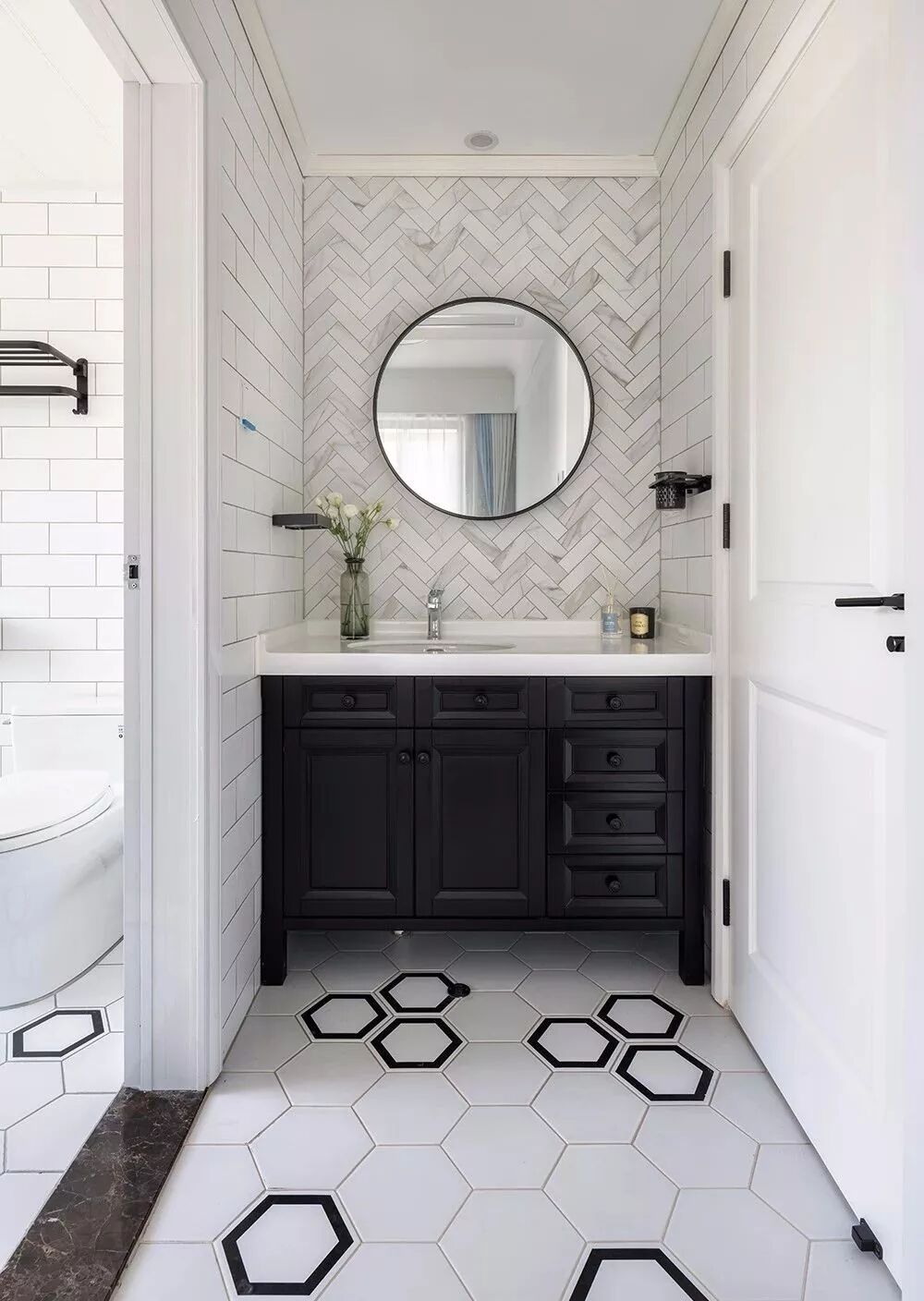 ▲ 主卫干湿分离,拼花六边砖地面搭配人字铺镜面背景,黑色浴室柜耐看显层次