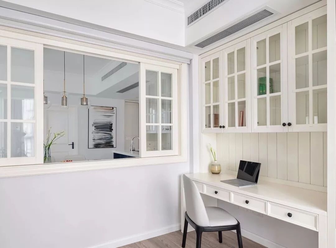 ▲ 书房与餐厅隔窗相邻互不干扰,米白色书柜可以容纳书籍和各式小摆设