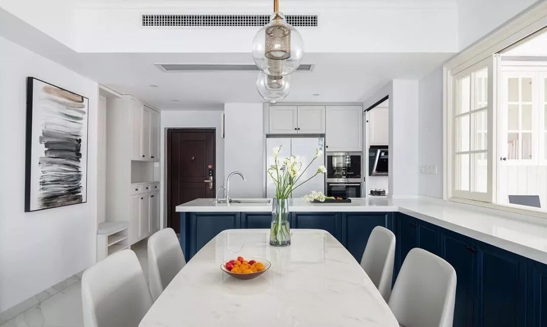 ▲ 从餐厨看向客厅,格局通透流畅,不着痕迹的自然色墙面,大理石纹路的地面,被宠爱的靛蓝,在视觉上依次丰满