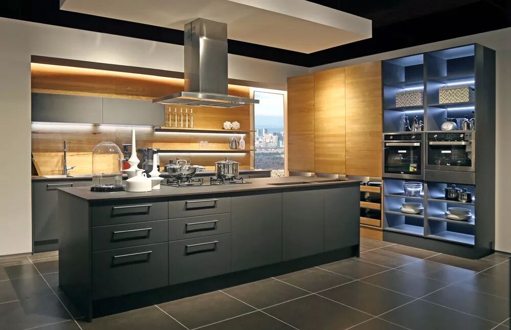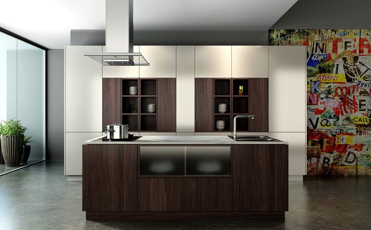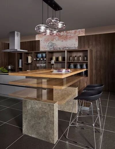 烤漆岛台穿插开放格的木质中高柜