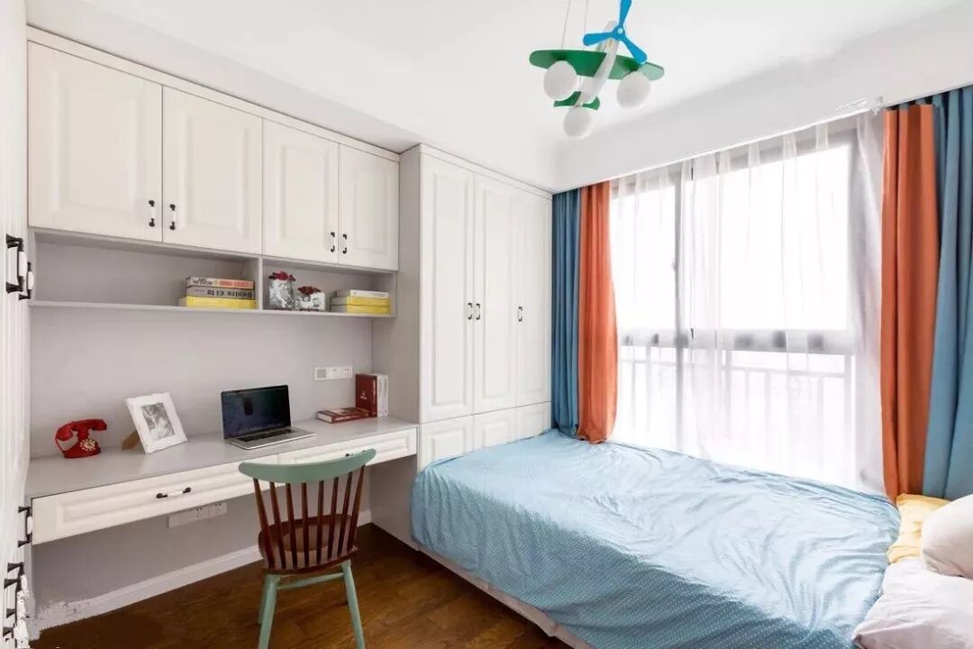 为了丰富榻榻米房的书桌,也可以取消大面积的书柜与衣柜,直接把书桌延伸到床尾,床尾的地方也可以当成座位,电脑可以充当电视,躺在床上看剧,非常不错。