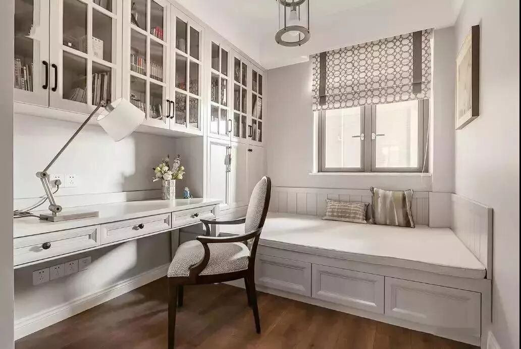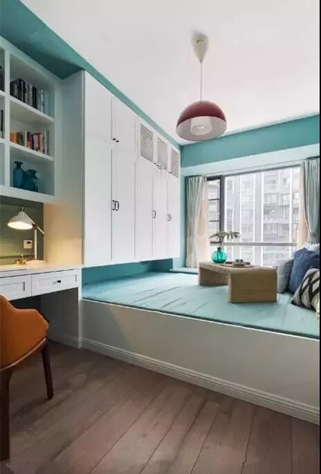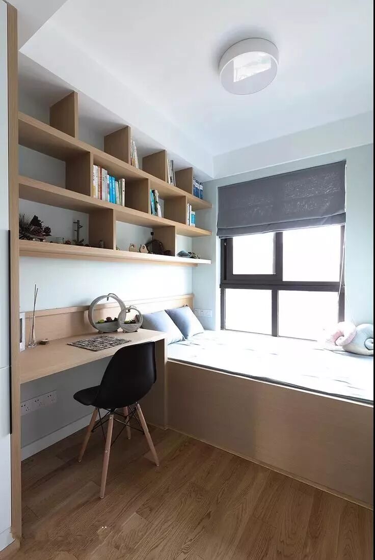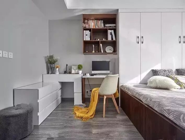 如果你希望装榻榻米的这间房间可以当卧室又可以当书房,可以选择在榻榻米床头或者床尾安装衣柜、书架和书桌,这样不仅可以收纳衣物,书架用来办公,一举多得