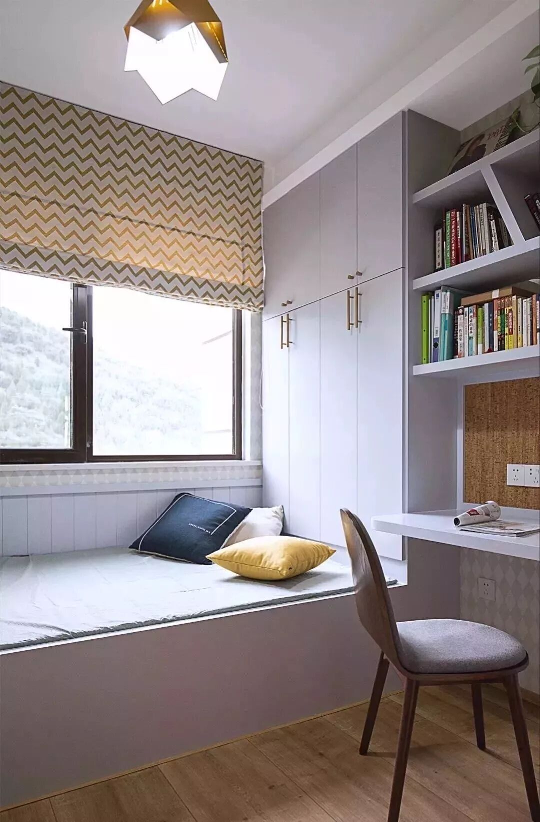 如果安装榻榻米的这间卧室,主要功能是书房或者书比较多的话,可以在榻榻米床的周围设计收纳书柜,如果床的长度不够,设计成吊柜也不错。