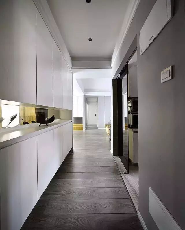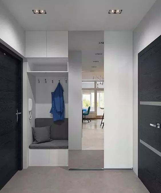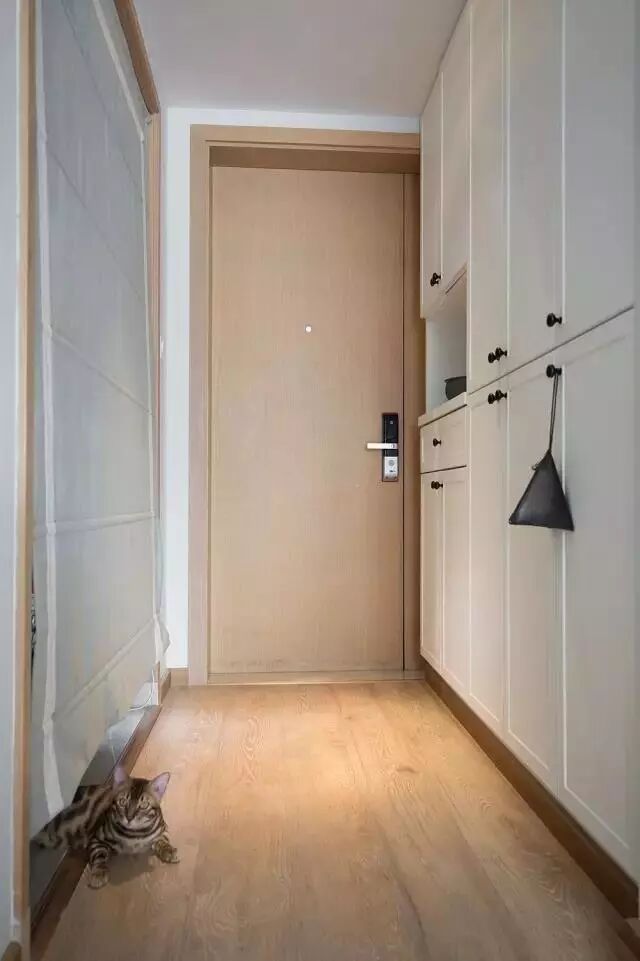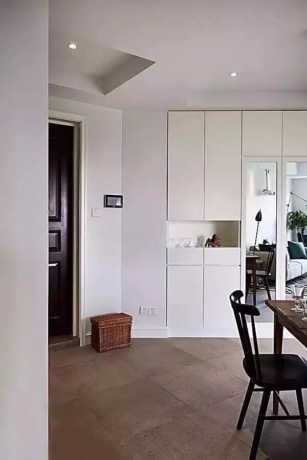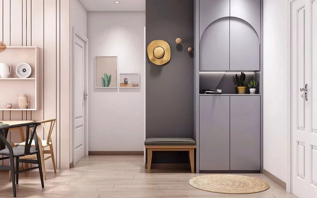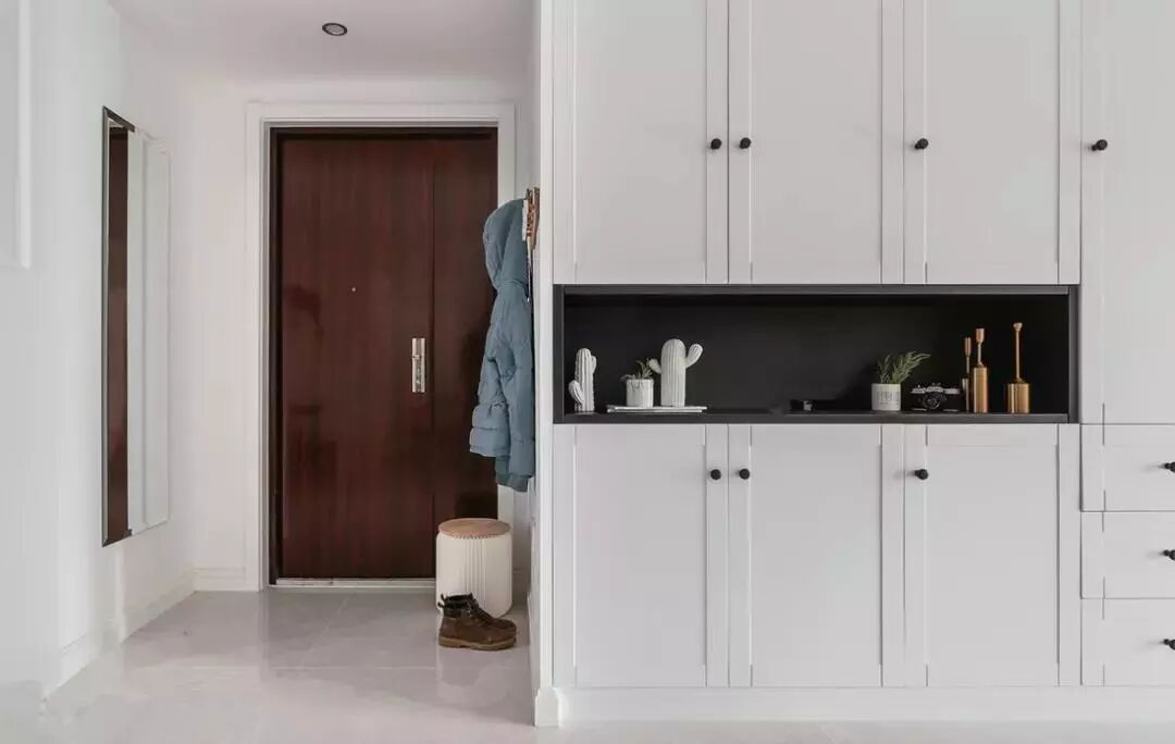 当然,不是所有开门见厅的户型都放得下一个假玄关,如果门口的空间很小,我们可以在门一侧打造一个嵌入式鞋柜。