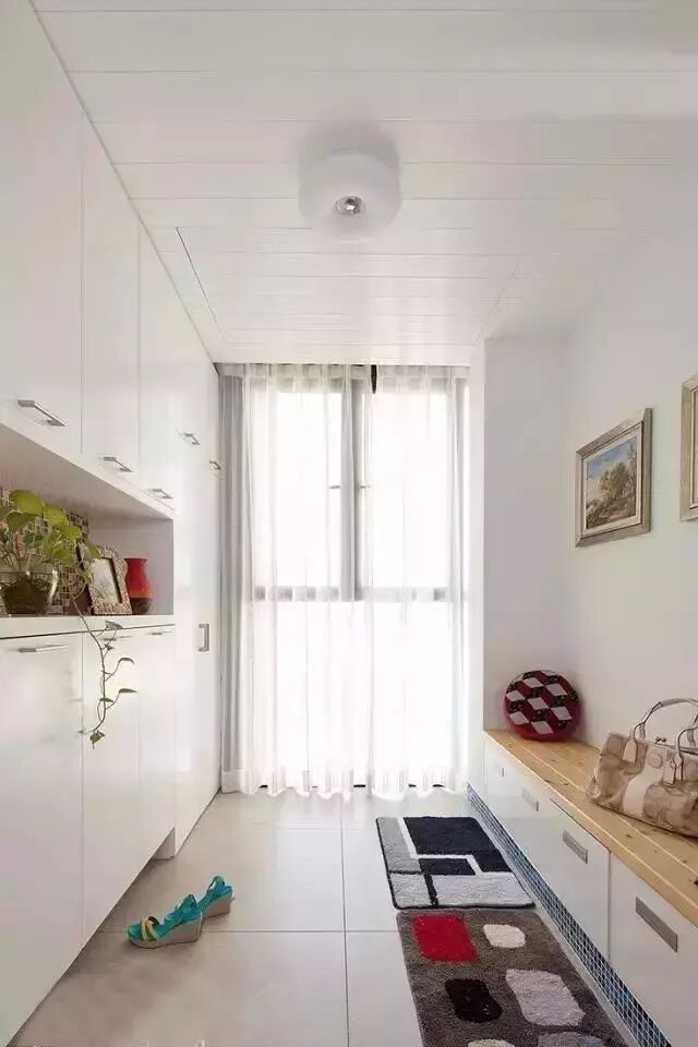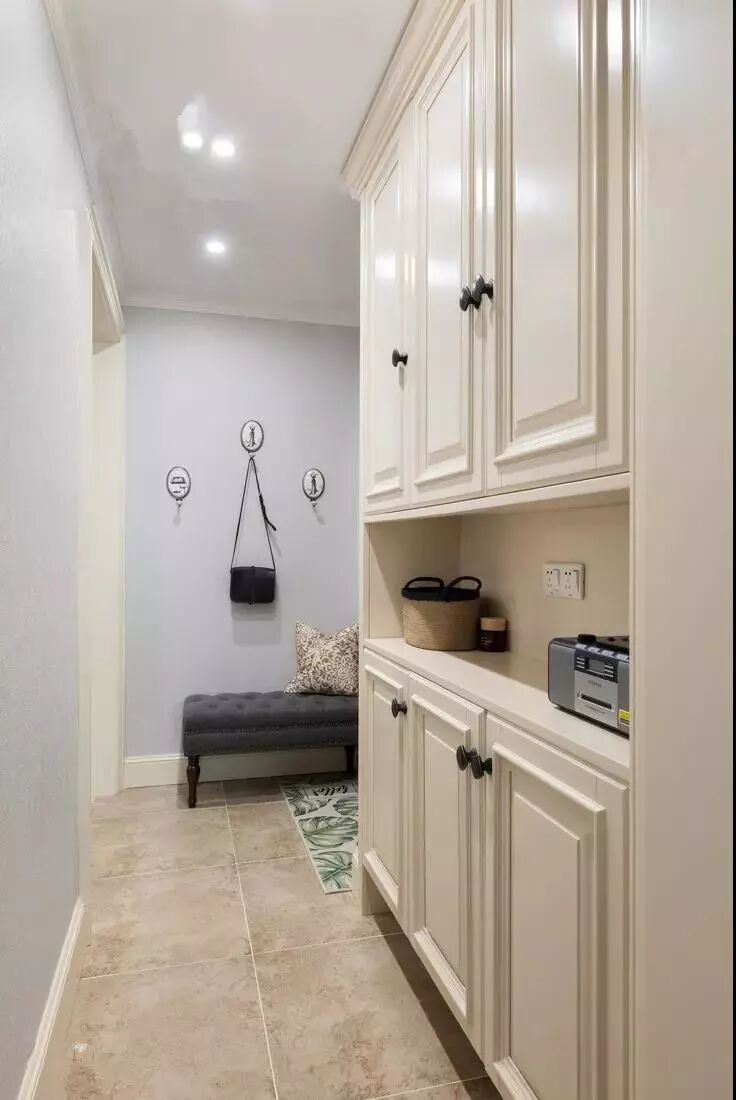 一般鞋柜都是宽宽矮矮的,但现在户型比较小,可以考虑将鞋柜和其他柜子做成一体式,看起来协调,收纳能力也足够。