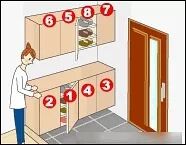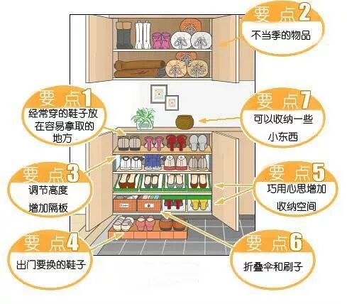 POINT 1 鞋柜分容易存取的地方和不容易存取的地方。根据鞋子使用的频率分开放置。 难易程度如下图所示。