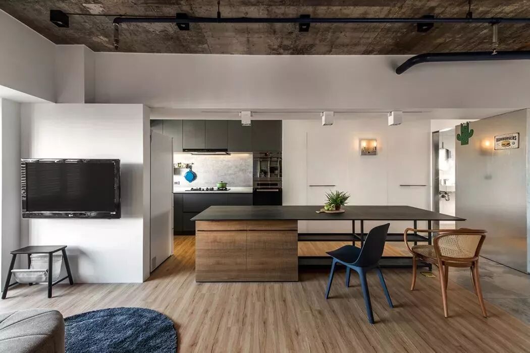 ▲客厅的电视墙也是非常的简洁,水泥质感的天花板,粗犷的设计也显得很是自然大方。